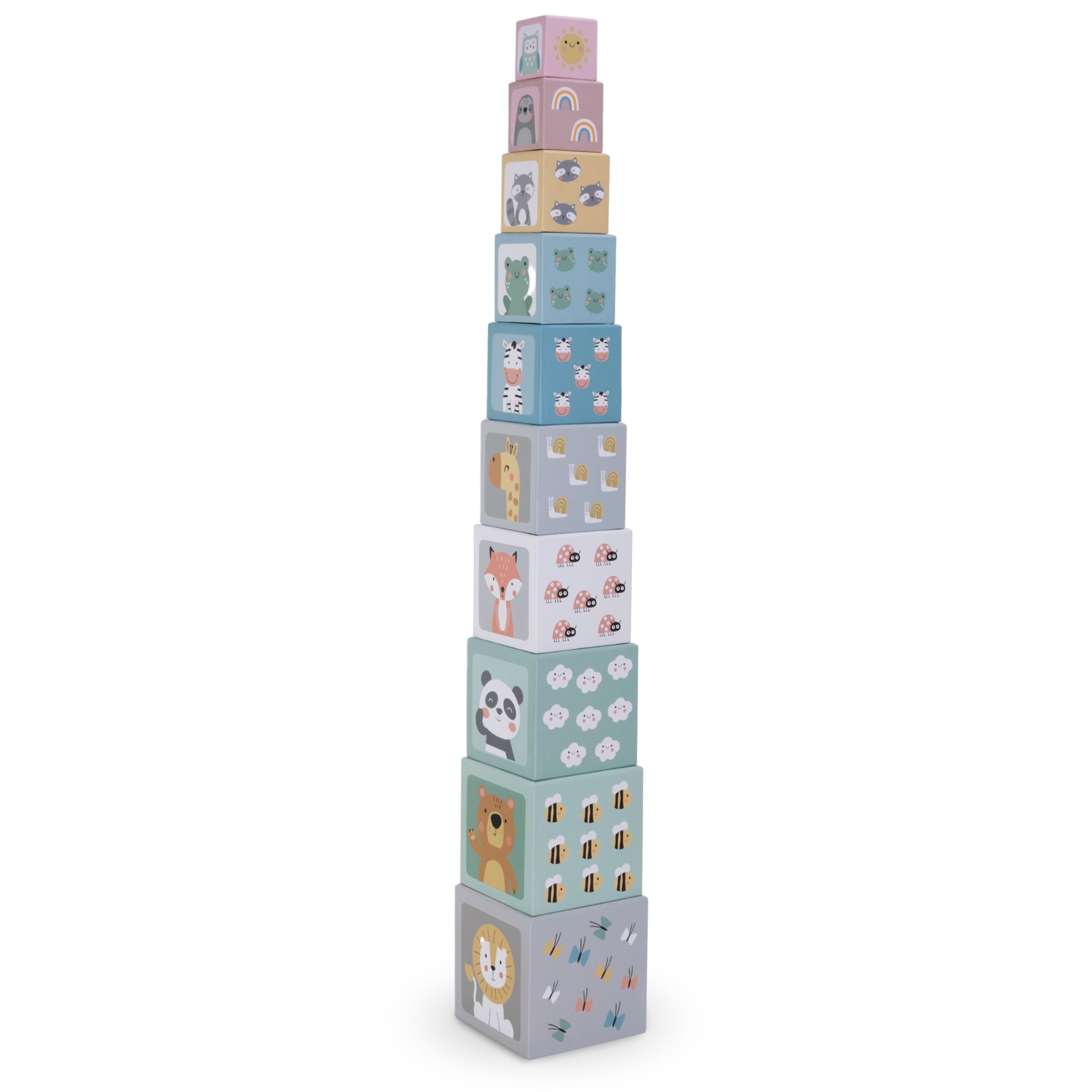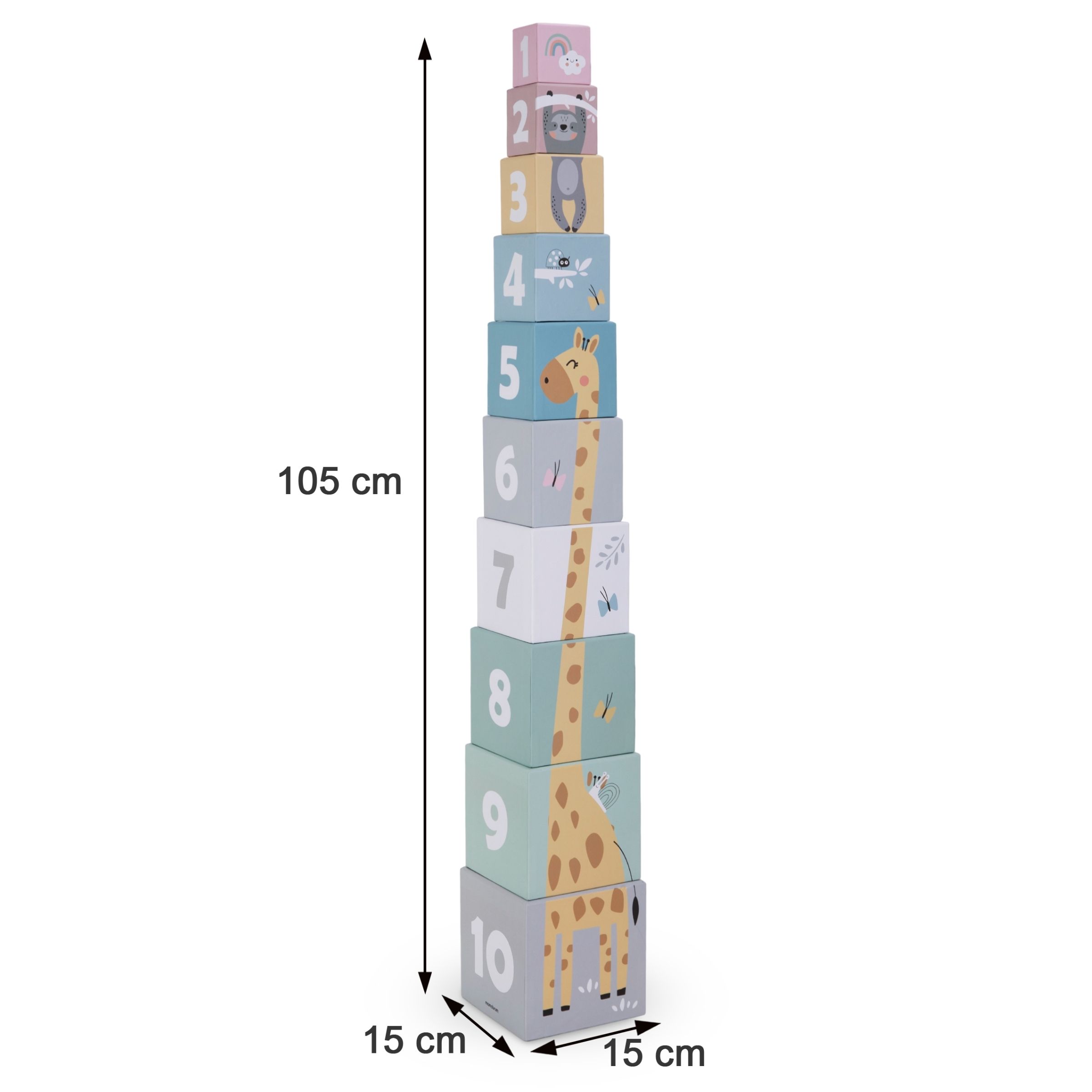 Virnastamistorn koosneb 10 erinevas suuruses papist kuubikutest. Kõik nende seinad on kaunistatud värvilise, pilkupüüdva trükiga. Väikelaps saab kuubikuid üksteise peale laduda ja seejärel oma ehitatud torni lammutada, mis pakub talle kindlasti palju rõõmu. Mitmevärvilistest klotsidest saab kahtlemata lapse toa kaunistus. Tänu oma disainile köidavad need tõhusalt väikelapse tähelepanu.