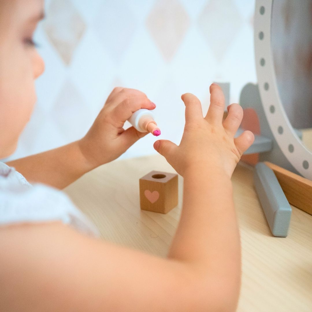Puidust riietuslaud võimaldab lastel jäljendada täiskasvanuid ja õpetab neile, kuidas hoolitseda oma ilu eest. Välja tõmmatavas, südamekujulises sahtlis on kõik vajalikud tarvikud ning lapse pikkusele kohandatud tugitooli tagab mugava asendi hoolitsemise ja kosmeetiliste protseduuride ajal. Suur ovaalne peegel ja praktilised riiulid mõlemal pool peeglit täiendavad välimust.