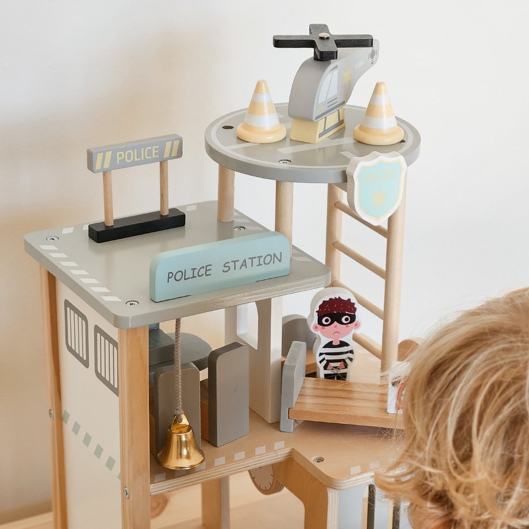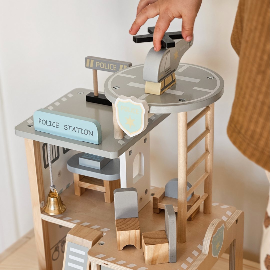 Arvukate tarvikutega varustatud puidust politseijaoskonna abil saavad väikelapsed mängida tagaajamisstseene ja muudki! Mänguasi võimaldab väikelapsel loomingulisi ideid realiseerida ja võtta endale julge korrakaitseametniku rolli. Politseijaoskond on varustatud helikopteri maandumisplatvormi ja mööbliga, kus politseinikud saavad vabal ajal puhata. Kiire politseiauto ei lase ühelgi kurjategijal põgeneda ja koolitatud jäljekoer ei jäta ühtegi jälge.