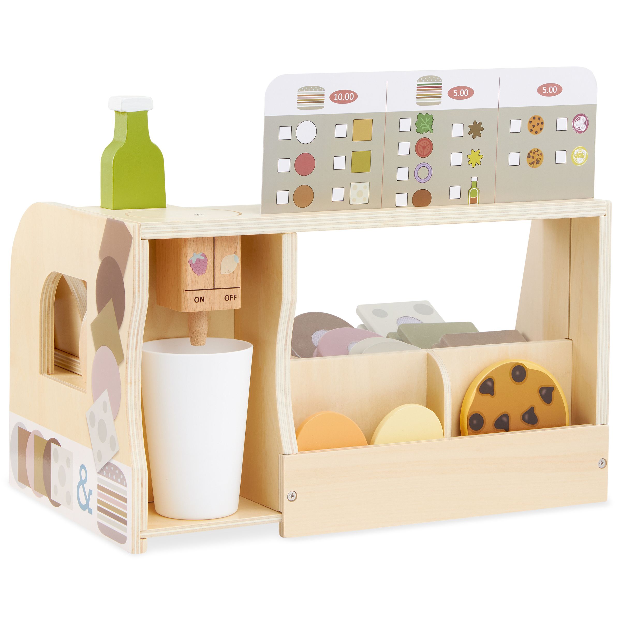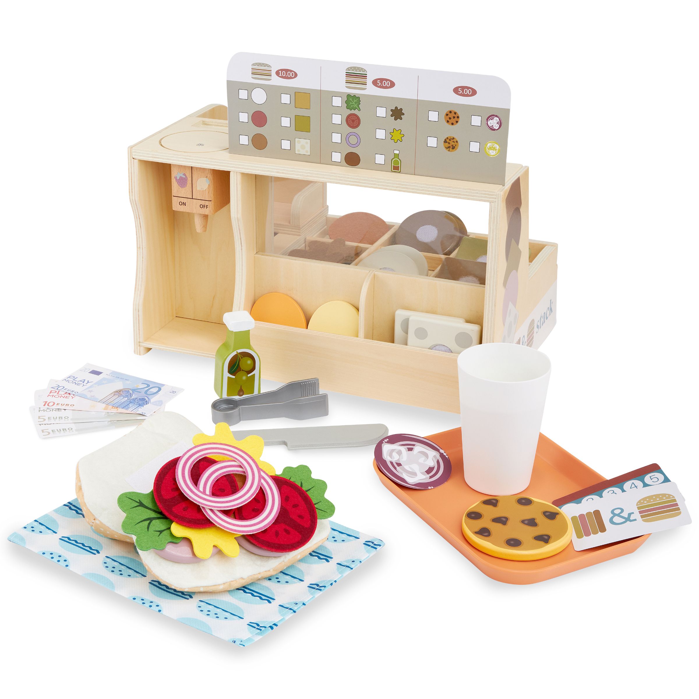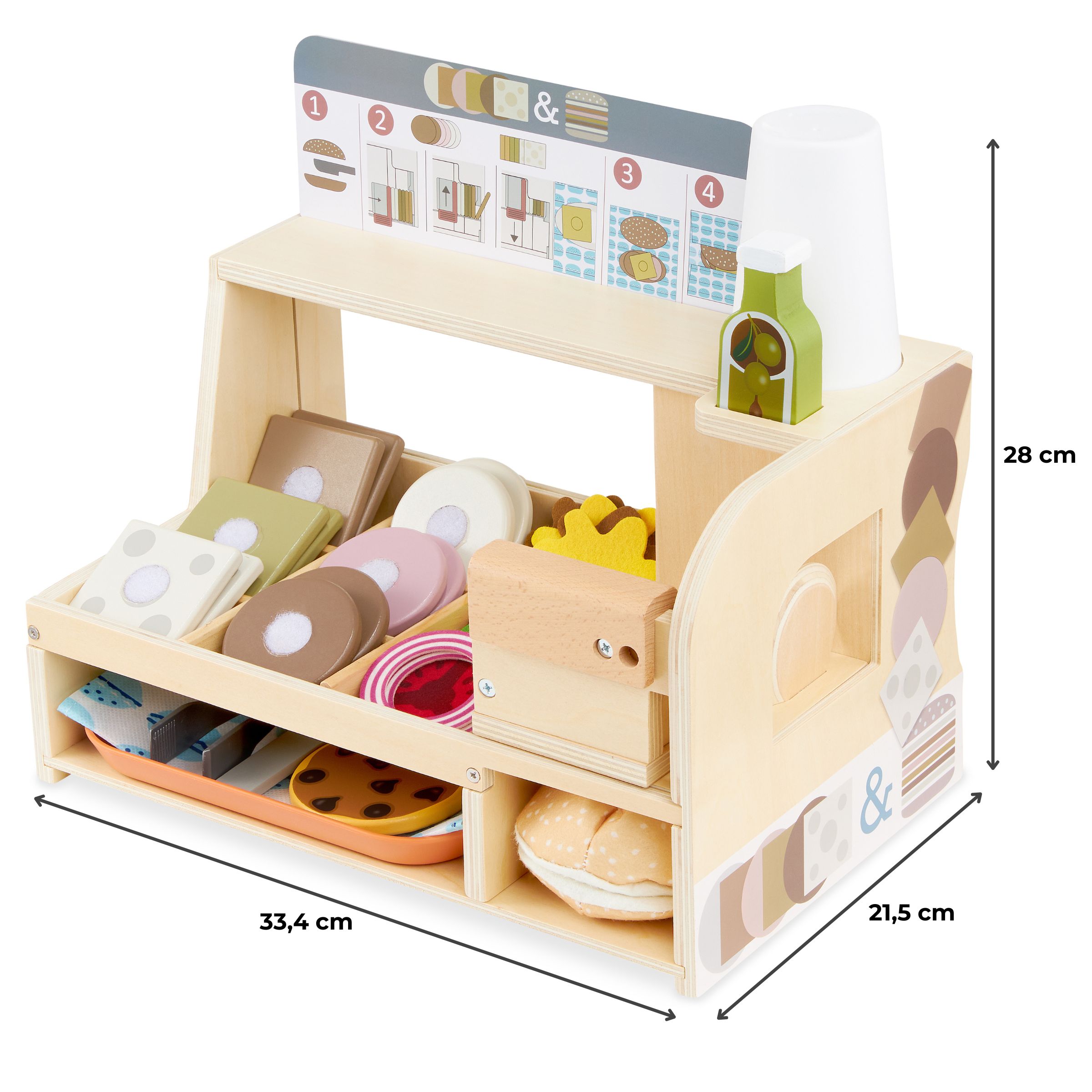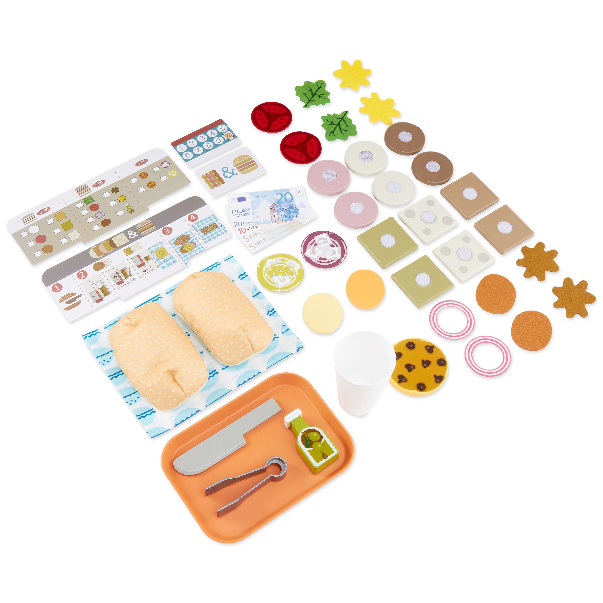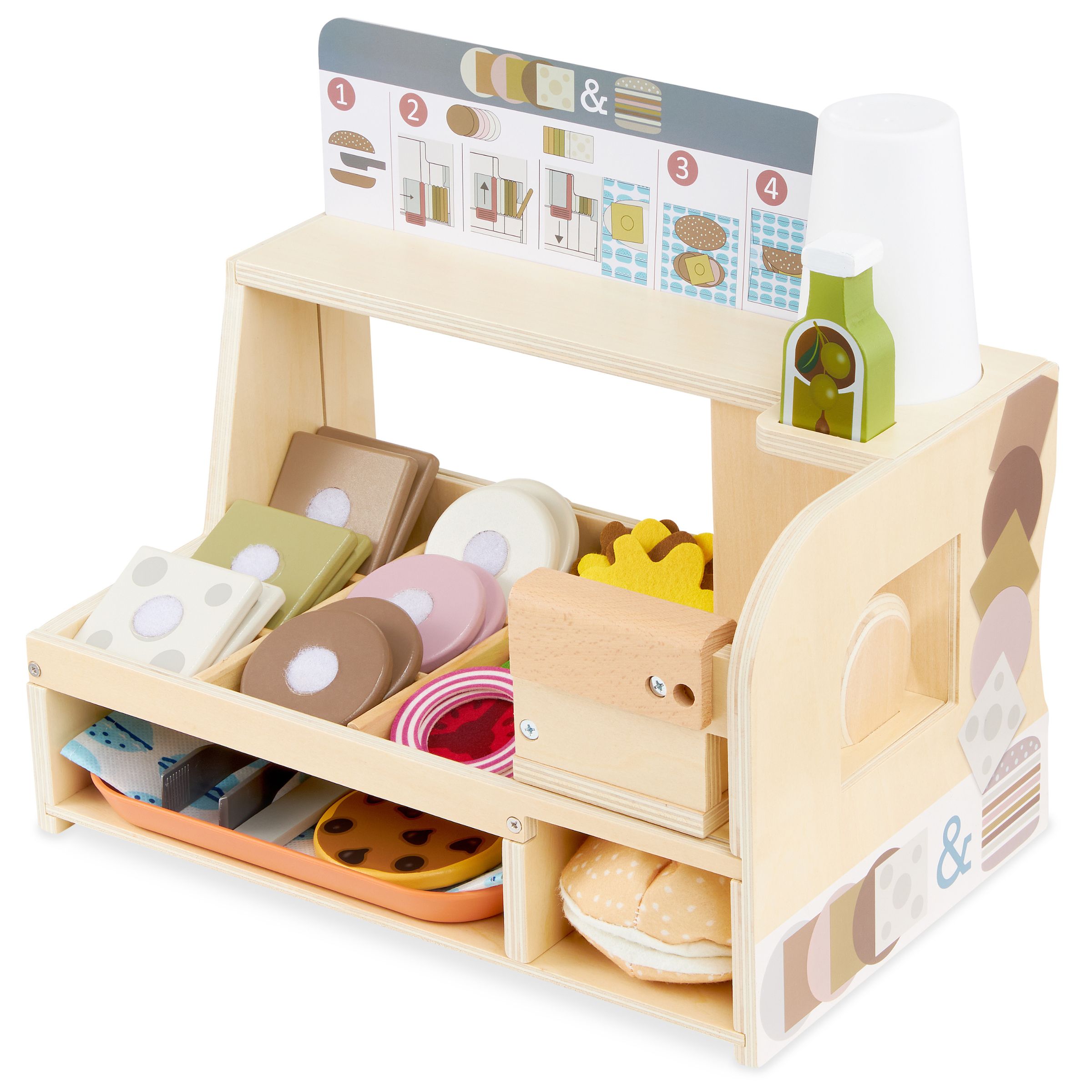 Selle arvukate tarvikutega varustatud mänguasja abil saab teie laps võtta värske ja värvilise võileivamüüja rolli. Sest vastupidavast puidust valmistatud võileibade riba sisaldab kõike nende valmistamiseks vajalikku. Tõeline tipphetk on teisaldatav viilutaja, mis võimaldab lapsel juustu või liha "viilutada". Võileiva koostisained on velcro-kinnitusega, nii et saate hõlpsasti maitsva võileiva kokku panna. Nüüd on vaja vaid jooki ja maitsev söök on valmis!