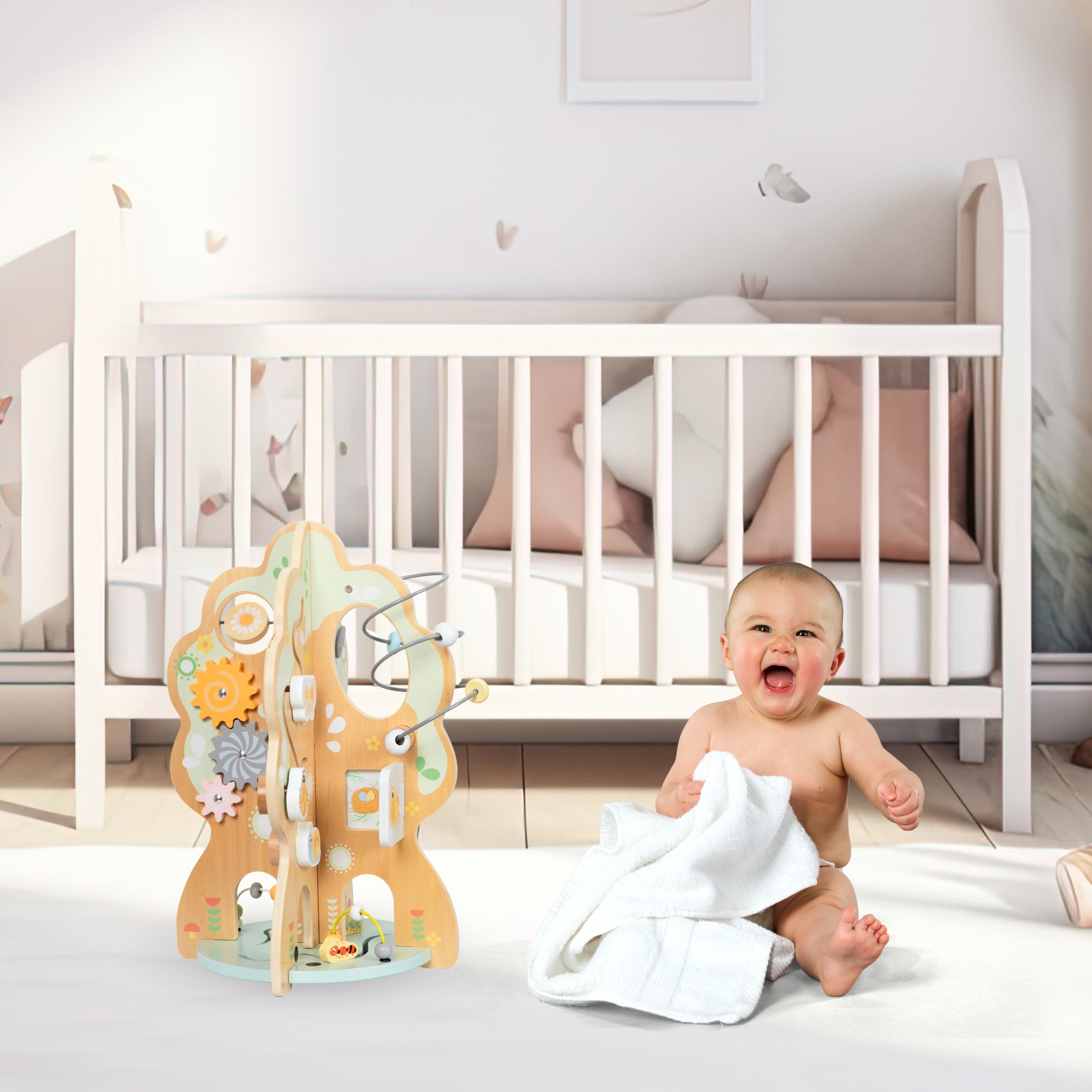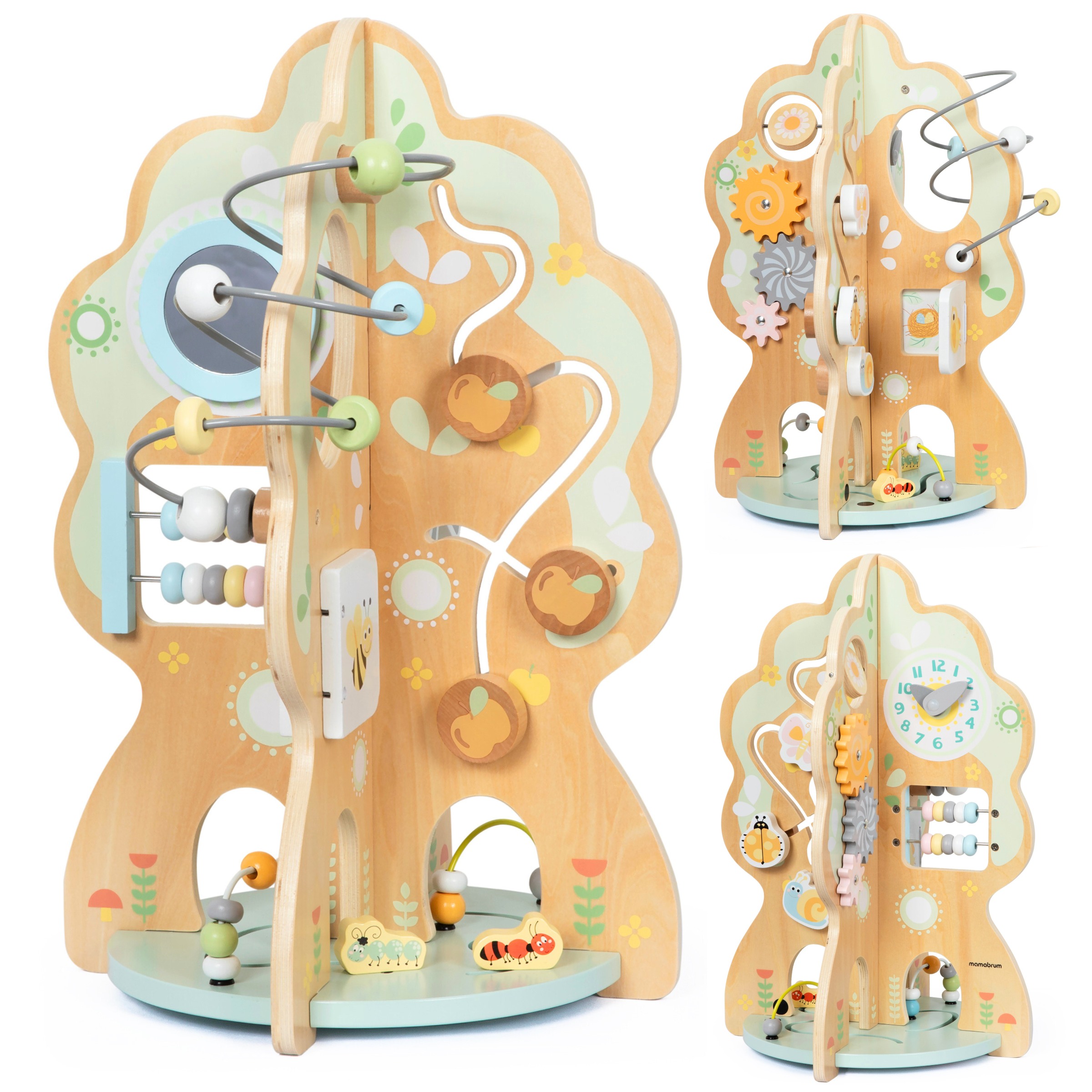 Puukujuline õpetlik mänguasi äratab kahtlemata igas lapses uudishimu ja tõmbab tema tähelepanu. See sisaldab elemente, mis võimaldavad teie lapsel mängida kuni 10 erineval viisil ! Teie väike laps saab liigutada helmeid mööda mootoriaasa, panna tuuliku liikuma, vaadata väikesesse peeglisse , pöörata käike ja teha muud. Puul on ka kell , pöörlev lill , liugurid puuviljade ja putukatega ning avanev uks üllatusega. See on unistuste kingitus teie lapsele!