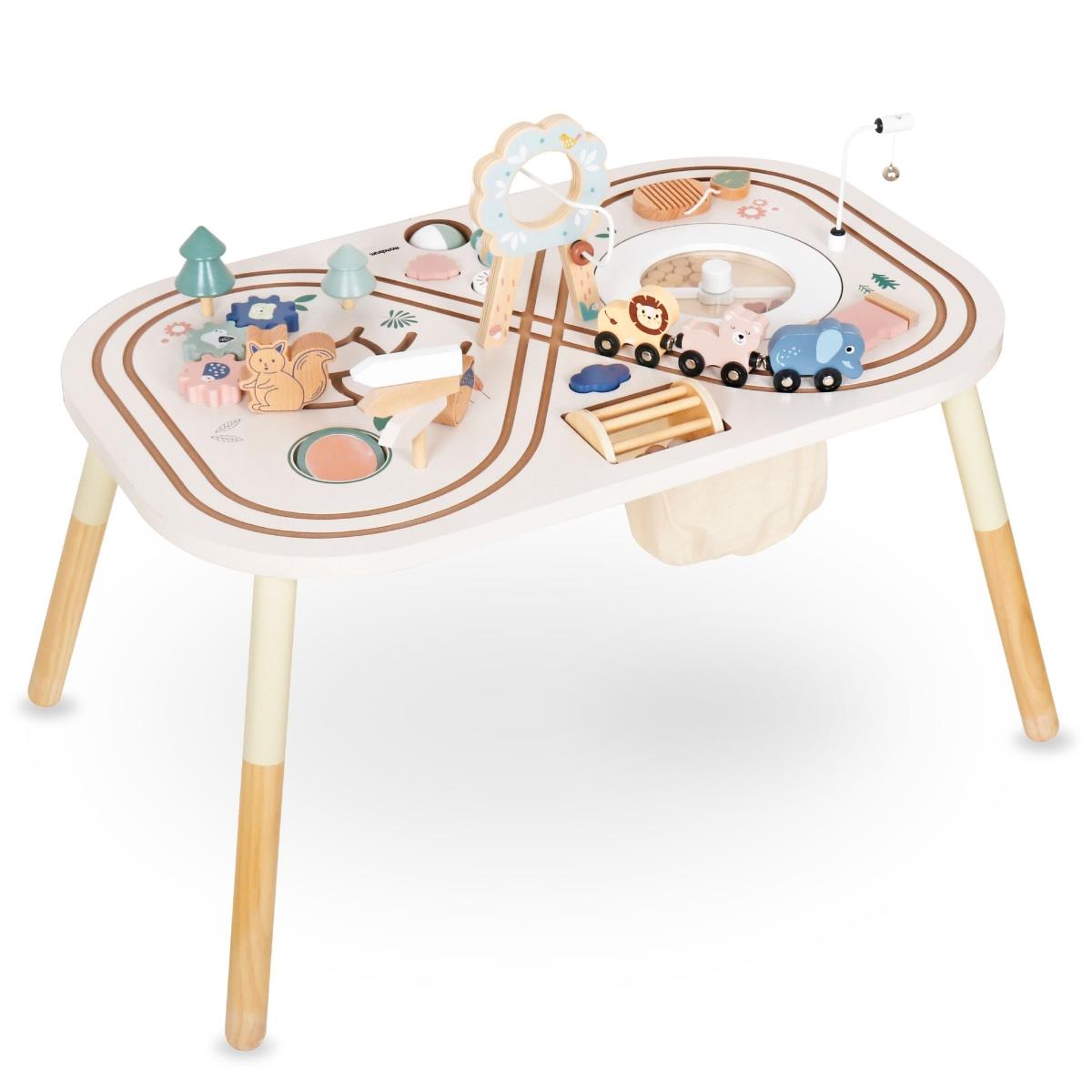 10in1 puidust õppelaud hõlbustab laste jaoks helide, kujundite ja värvide avastamist, stimuleerib nende meeli ja treenib nende väikeseid sõrmi. Väikelaps saab rongi liigutada mööda laua servadesse paigutatud ja keskel ristuvat rada, keerata hammasrattaid või mängida "piilumist", avades ja sulgedes ust.
