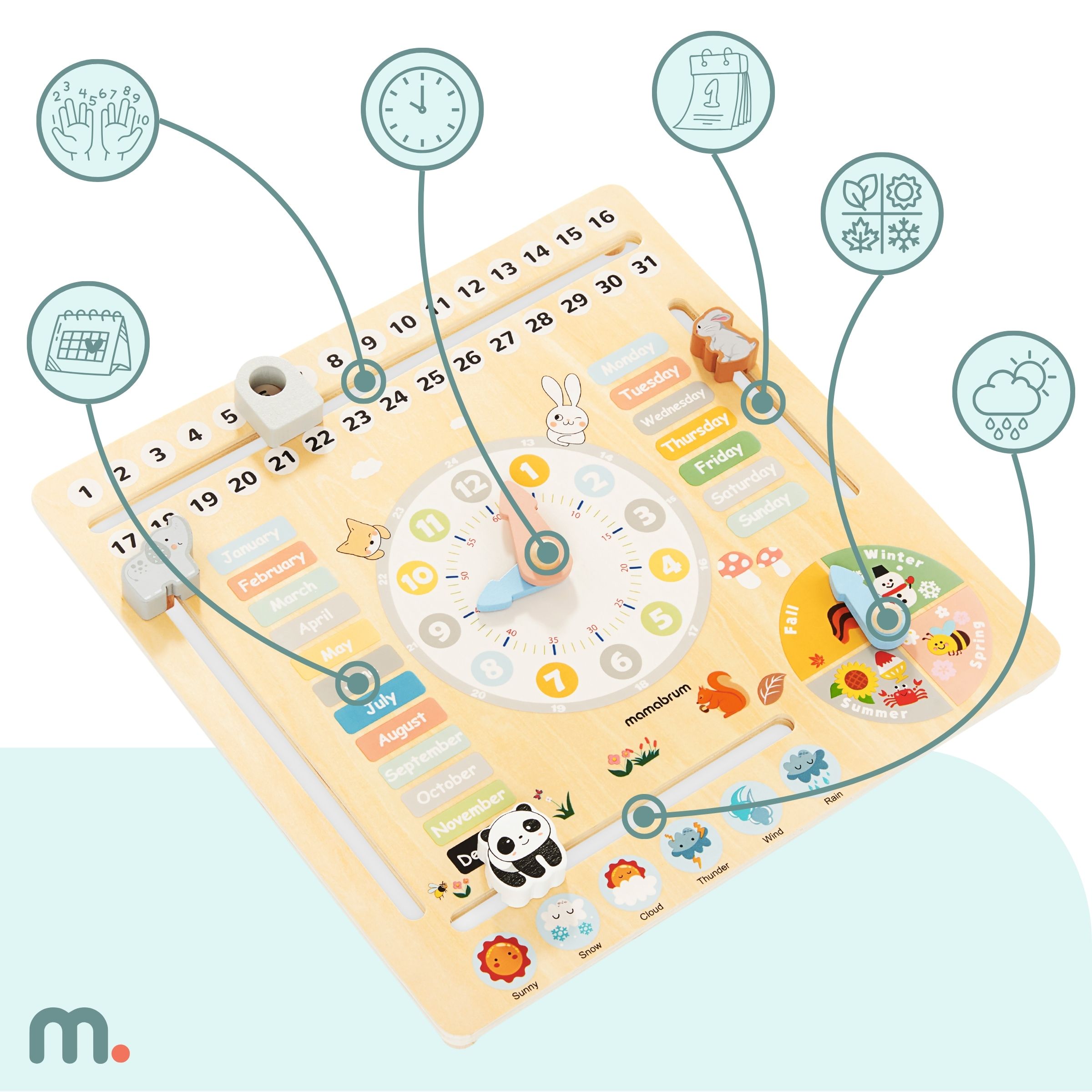Milline nädalapäev on meil? Ja kuu? Puidust kalender aitab teie väikestel mõista aja kulgemist ja jälgida looduses toimuvaid muutusi. Värviline puidust tahvel võimaldab väikelastel liigutada armsaid loomi, et määrata tänane kuupäev ja keerata kella näitajad, et valida õige kellaaeg või aastaaeg.