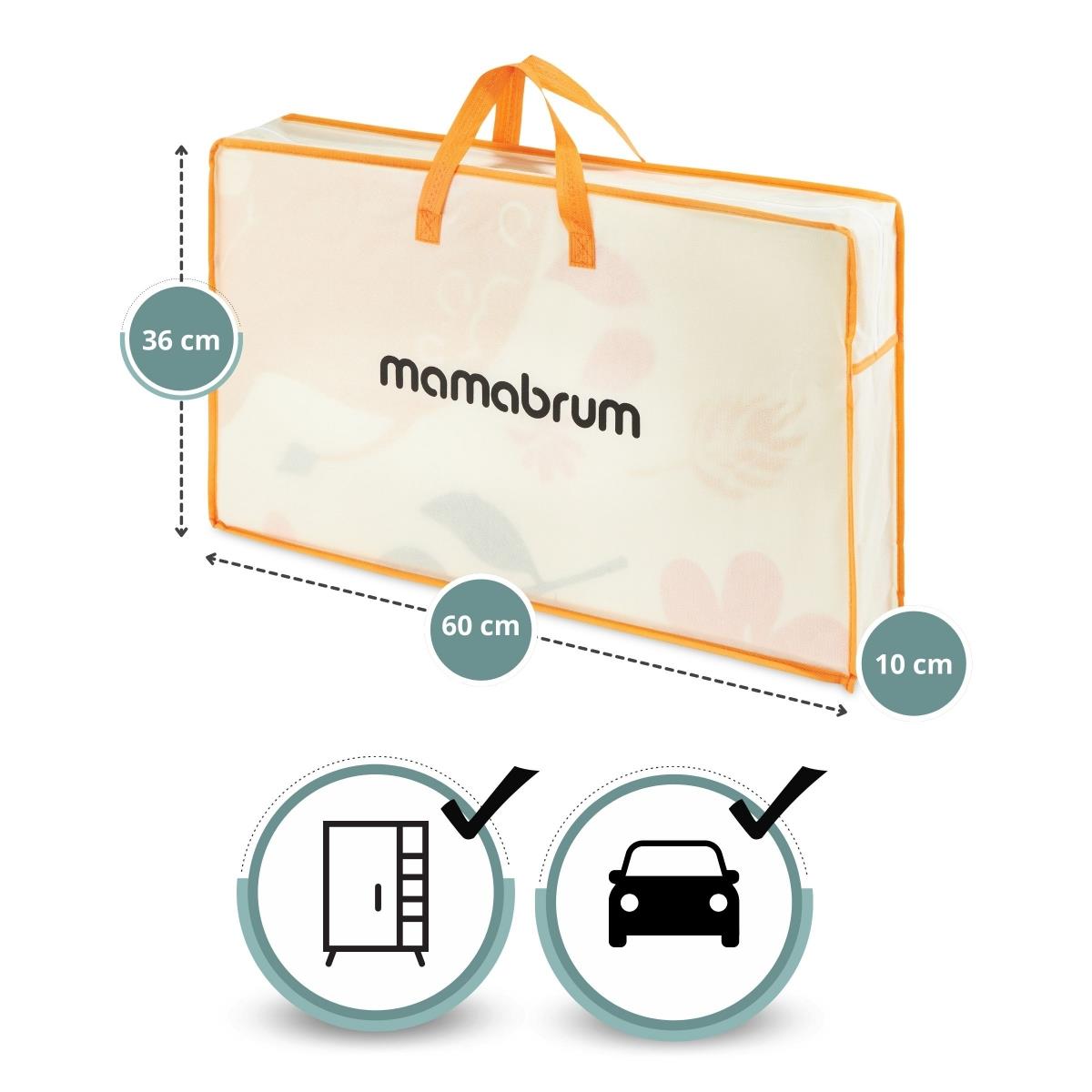 Kokkuvolditud kujul võtab vahtmatt väga vähe ruumi ja seda on äärmiselt mugav transportida. Seda seetõttu, et vahtmatt on praktilises käepidemega kotis, mis tagab mugava käsitsemise. Kui seda ei kasutata, saab selle kiiresti kokku voltida ja ära paigutada. Kas olete mures, et kokkupandav matt on teie lapsele ebamugav? Ärge olge! Voldid ei ole teie lapsele tuntavad ja ei sega tema muretut mängu.