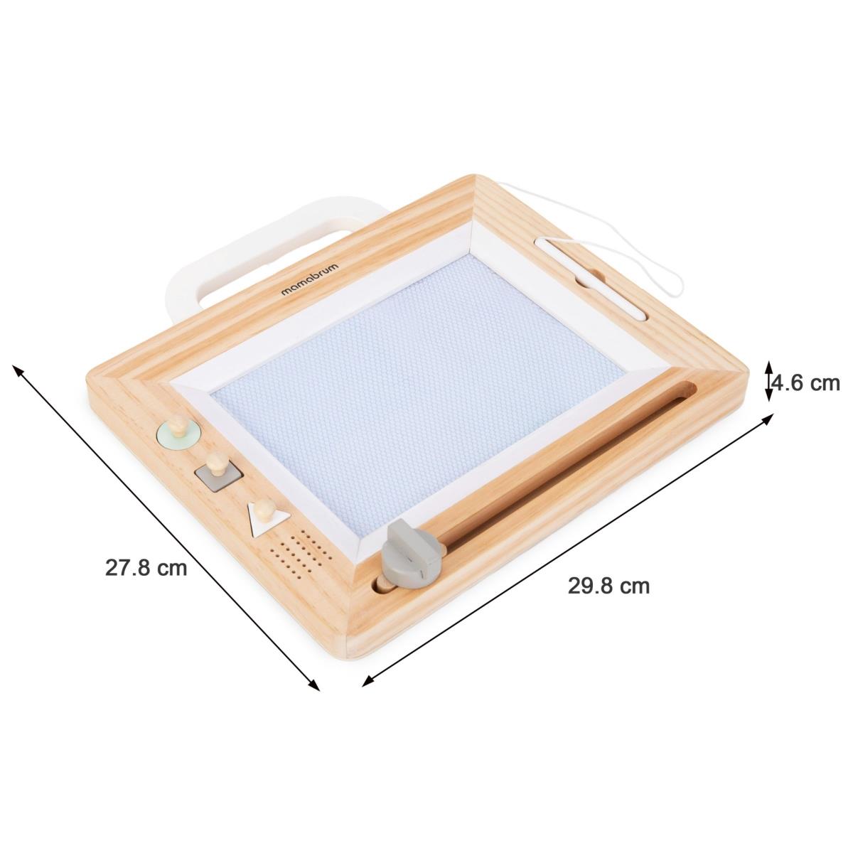 Magnetmarker võimaldab lastel luua lõputuid, loomingulisi ja mitmevärvilisi joonistusi! Eelmise pildi kustutamiseks lohistage lihtsalt puidust nuppu ja alustage uuesti joonistamist. Sülearvuti on varustatud käepärase käepidemega , mis muudab selle transportimise lihtsamaks. Meeleolu muudavad mitmekesise kujuga postmargid. Joonistuspliiats on nööriga tahvli külge kinnitatud, nii et teie väikelaps ei kaota seda.
