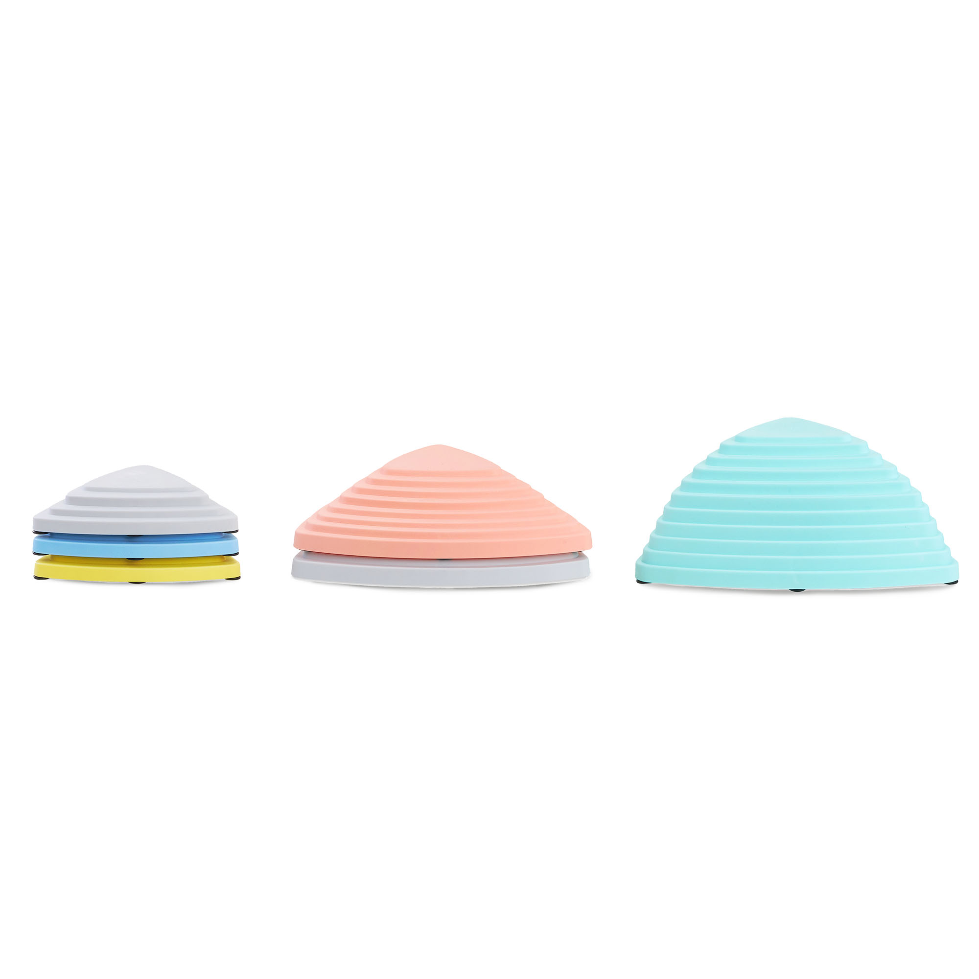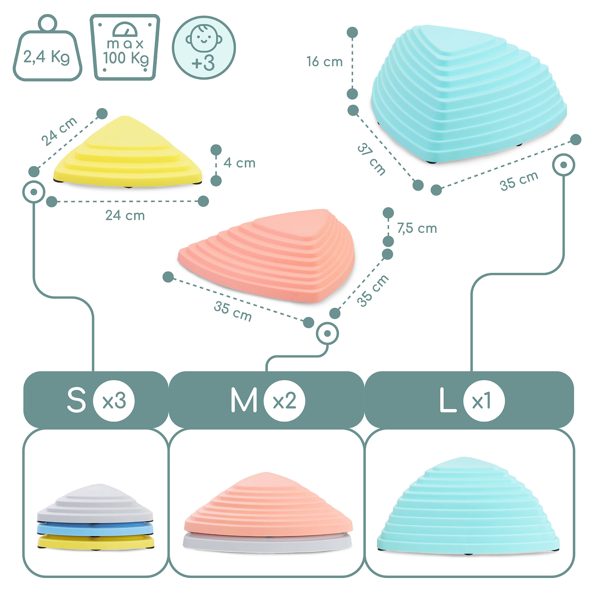 Sensoorsete kividelibisemisvastane pind hoiab ära laste valusad kukkumised ja tagab nende jalgadele suurepärase haardumise. Tänu vastupidavale, kuid kergele plastikule sobib komplekt ideaalselt väikelaste mängimiseks ja tasakaaluharjutusteks, toetades nende motoorset arengut turvaliselt.