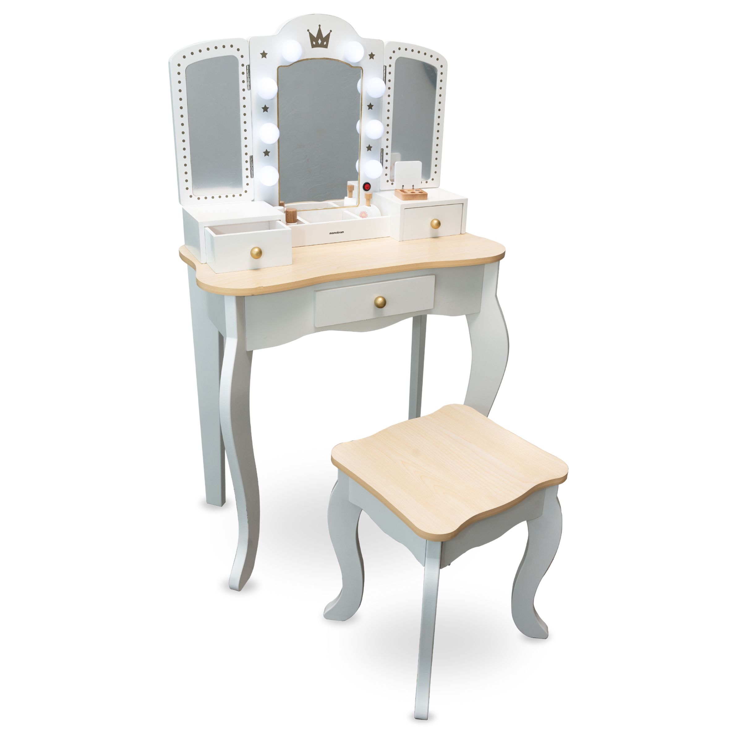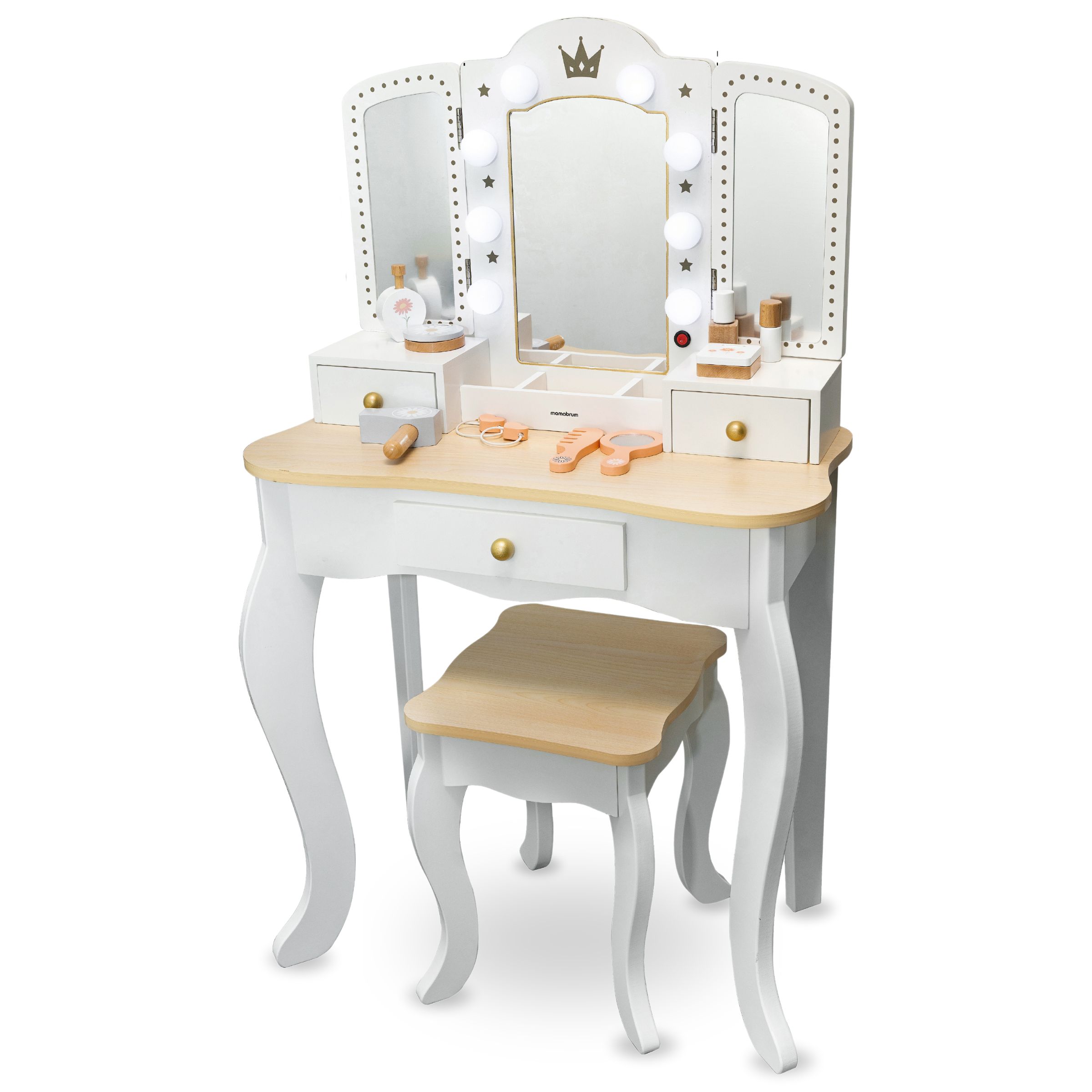 SeeLED-valgustuse ja 3-tiivase peegliga varustatud riietuslaud on iga väikese tüdruku unistus. Suur sahtlisse mahuvad hõlpsasti kõik teie lapse aarded, nagu mänguasjad, ehted, vidinad ja muu, mistõttu on laualaua korrastamine lihtne. Riietuslaud pakub ideaalset kohta ilunurgale, kuid mitte ainult. See on ka loominguliste mängude ja rollimängude keskus, näiteks juuksur, kosmeetik, meigikunstnik ja palju muud!