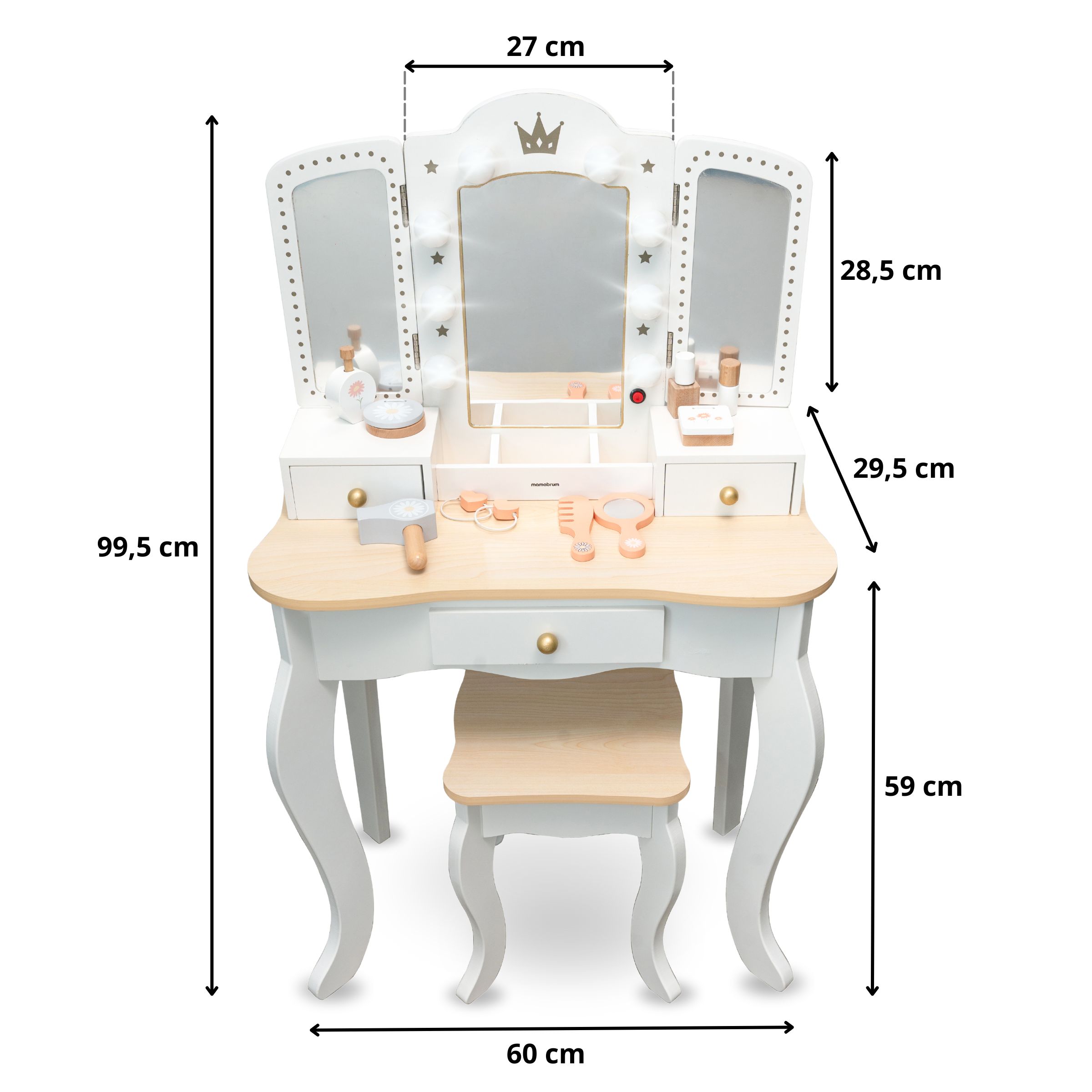 Atmosfäärilist, õrna valgustust pakuvad 8 LED-pirni. Peegli saab eemaldada, muutes seemislaua väikeseks kirjutuslauaks. Et näha oma nägu teise nurga alt, lihtsalt reguleerige küljepeegleid. Puidust garderoobilaud on ainulaadne kingiidee teie väikesele!