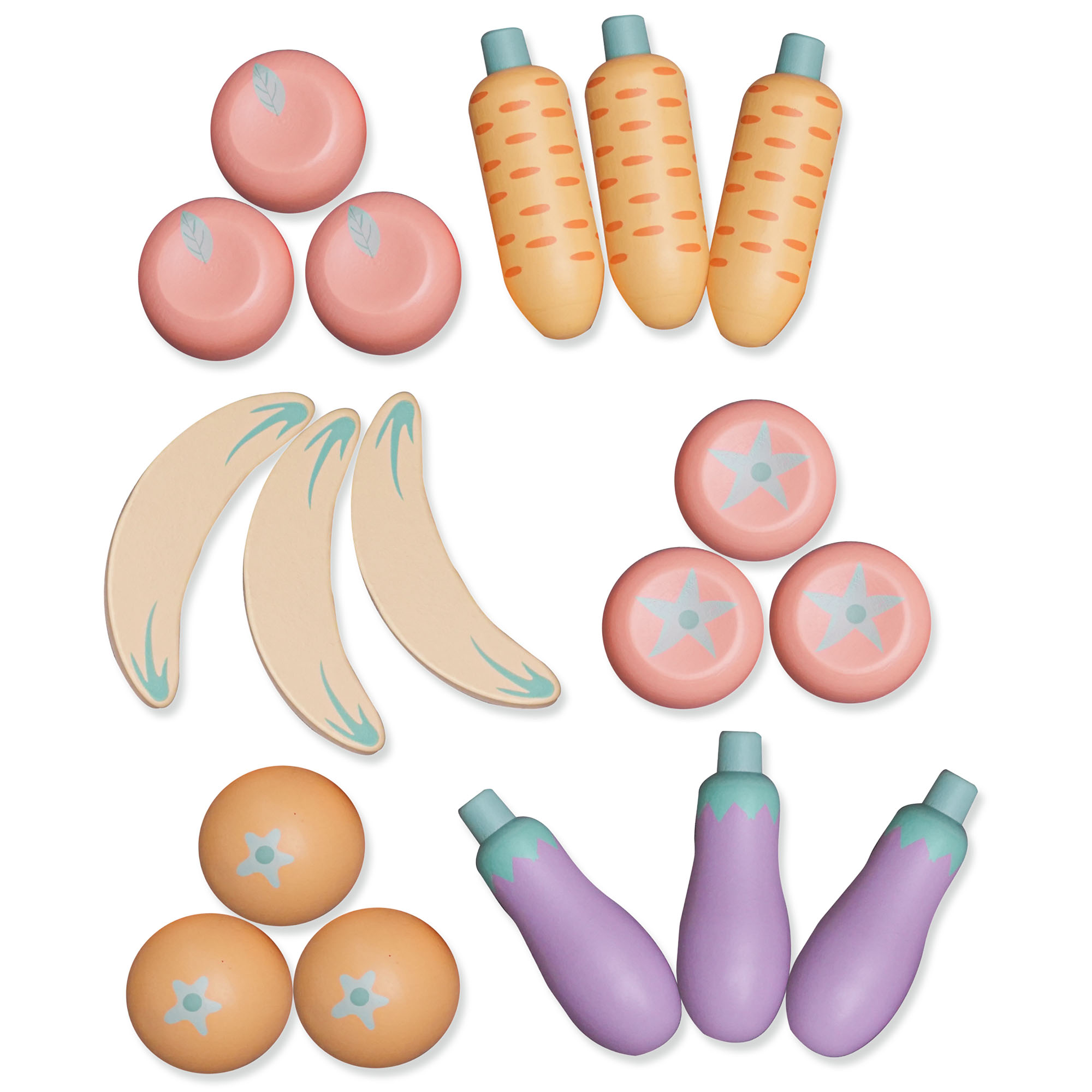 • puu- ja köögiviljad (porgandid, baklažaanid, banaanid, apelsinid, õunad, tomatid) - 18 tk.