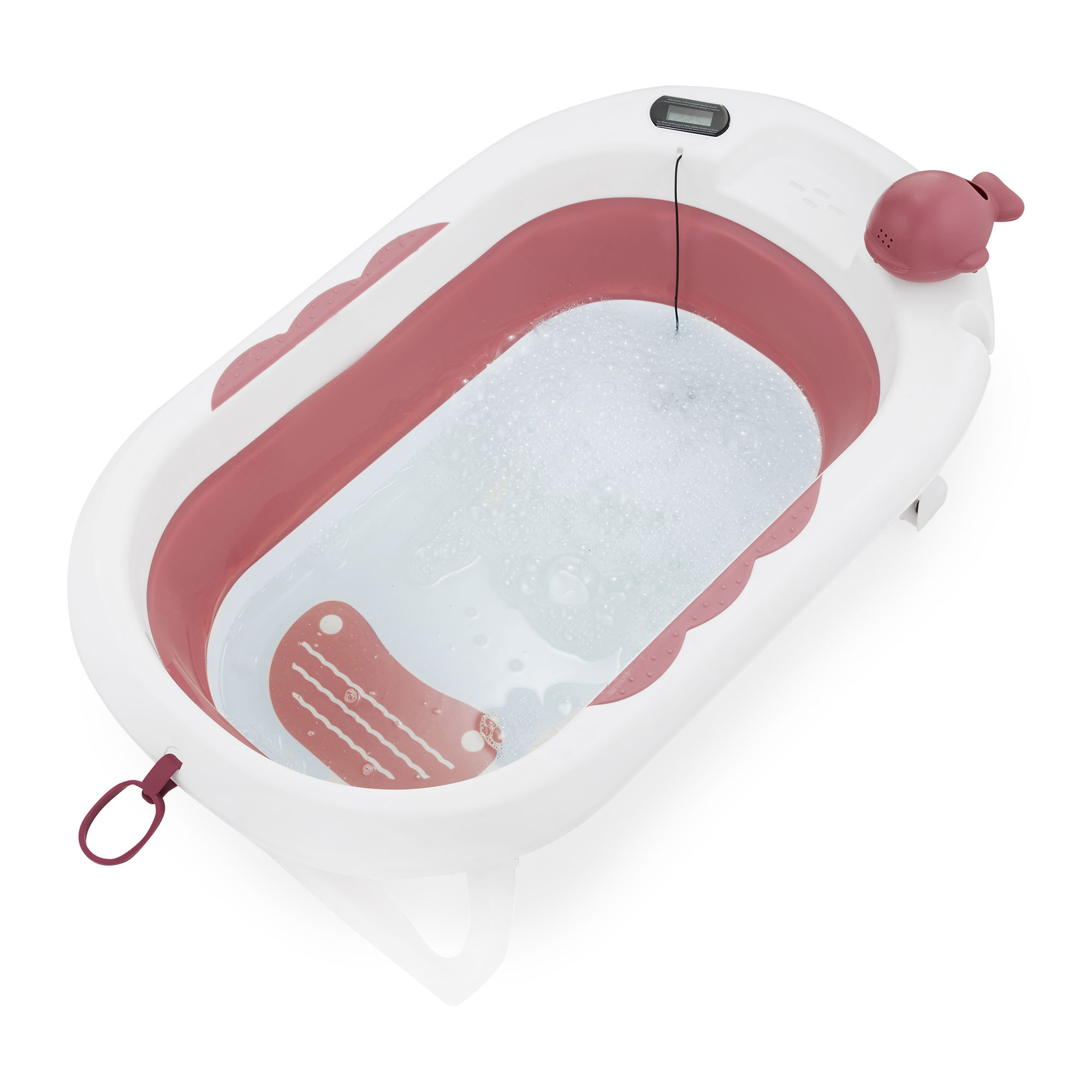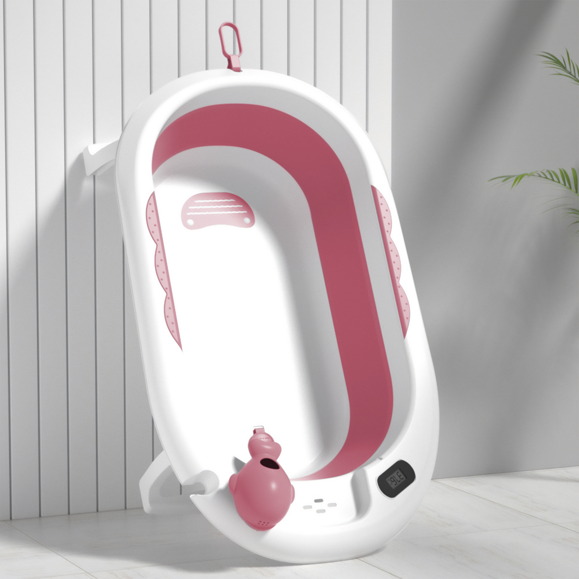 Kokkupandav beebivann koos termomeetri, sisendi ja statiiviga - värvus määrdunud roosa
