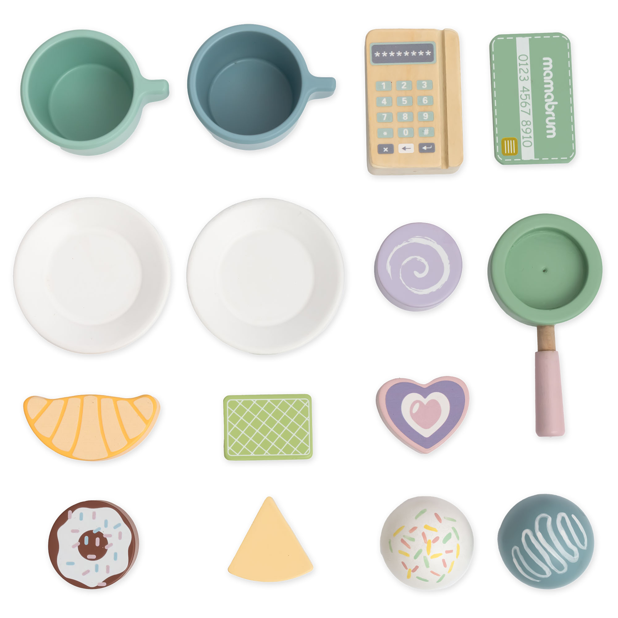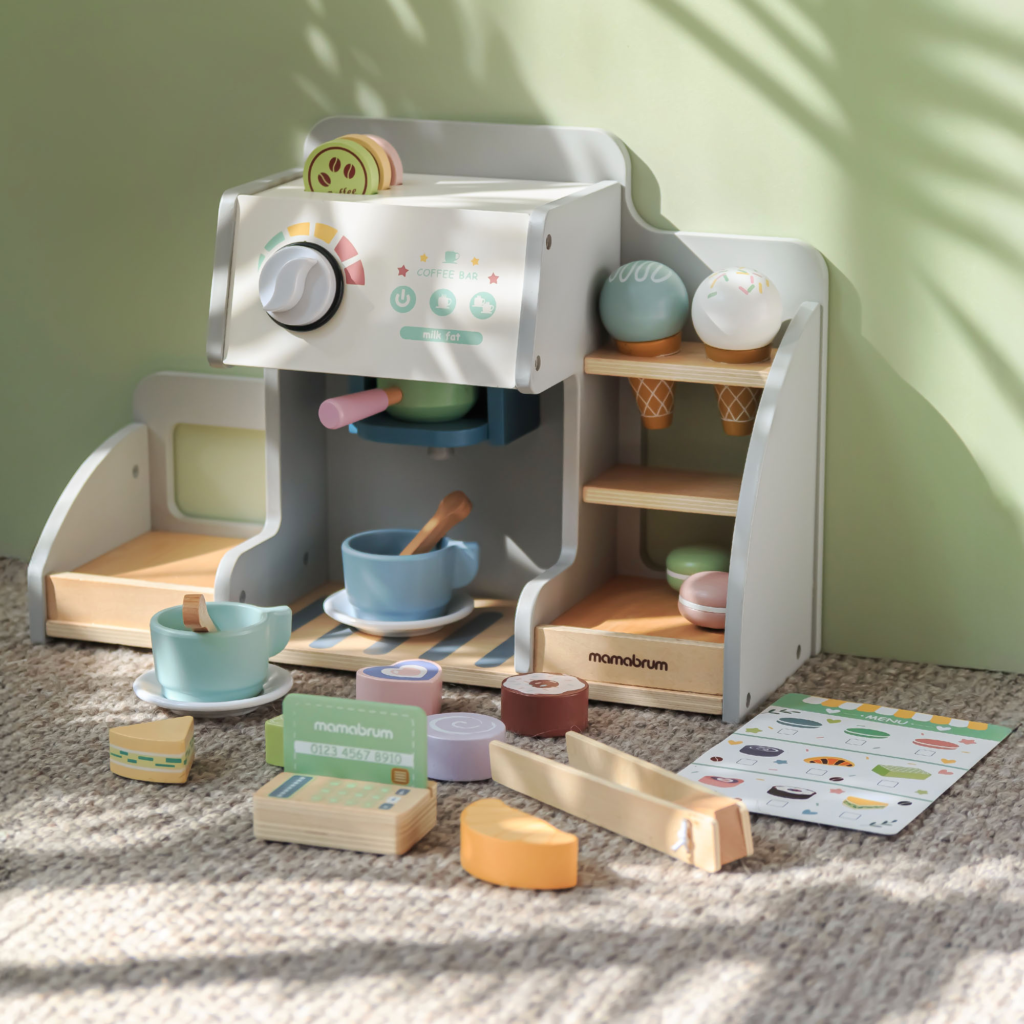 Varustatud arvukate tarvikutega, kohvik on loomingulise meelelahutuse retsept. Komplekt stimuleerib laste kujutlusvõimet ja sobib tänu pehmetele värvidele ja kaasaegsele disainile suurepäraselt lastetoa sisustusse. Looduslikust puidust valmistatud mänguasi toetab väikelaste sotsiaalsete, motoorsete ja kognitiivsete oskuste arengut. Tänu erinevatele elementidele ja realistlikele funktsioonidele - näiteks kohvimasina klõpsuvale valimisnuppu - võib mäng iga kord erinev välja näha.