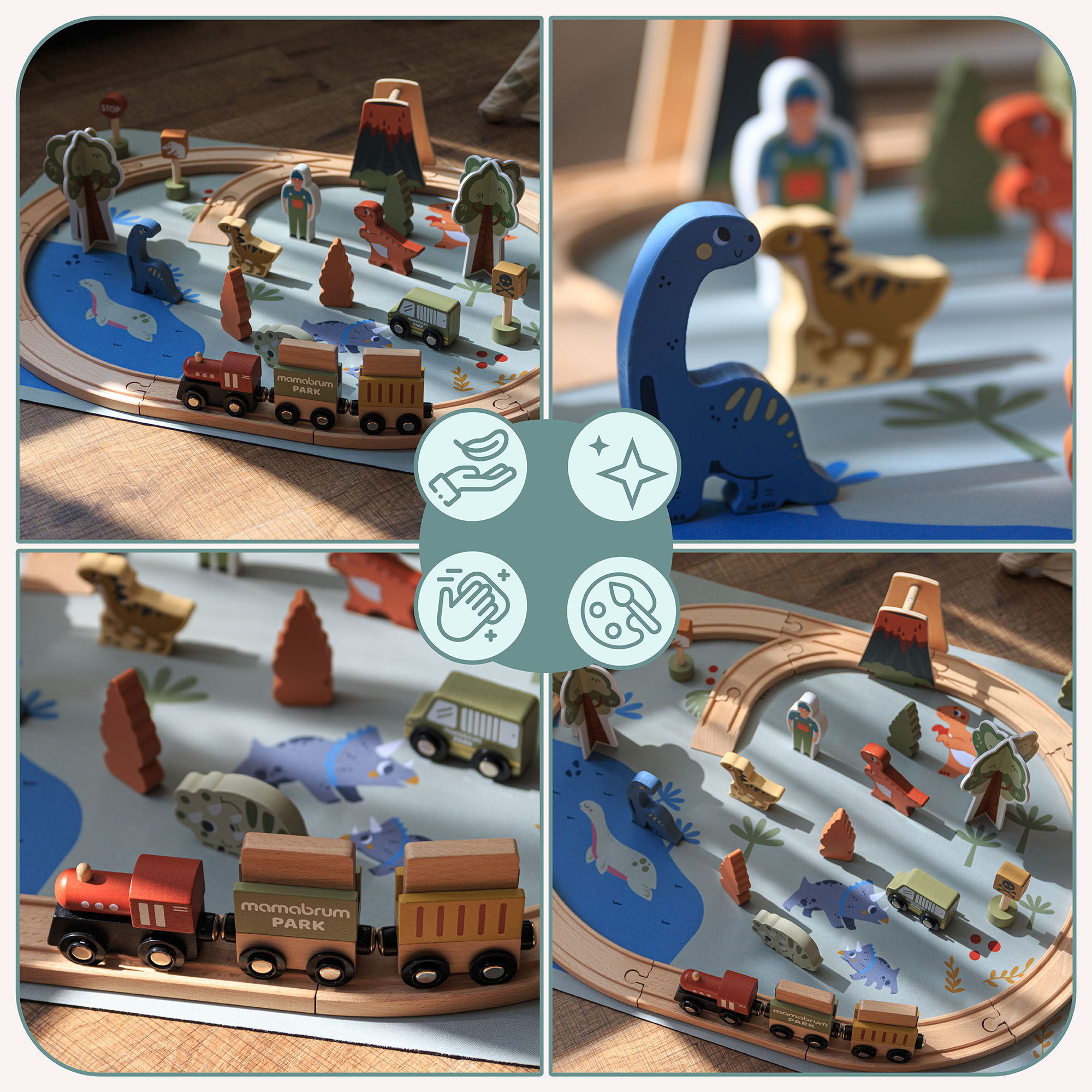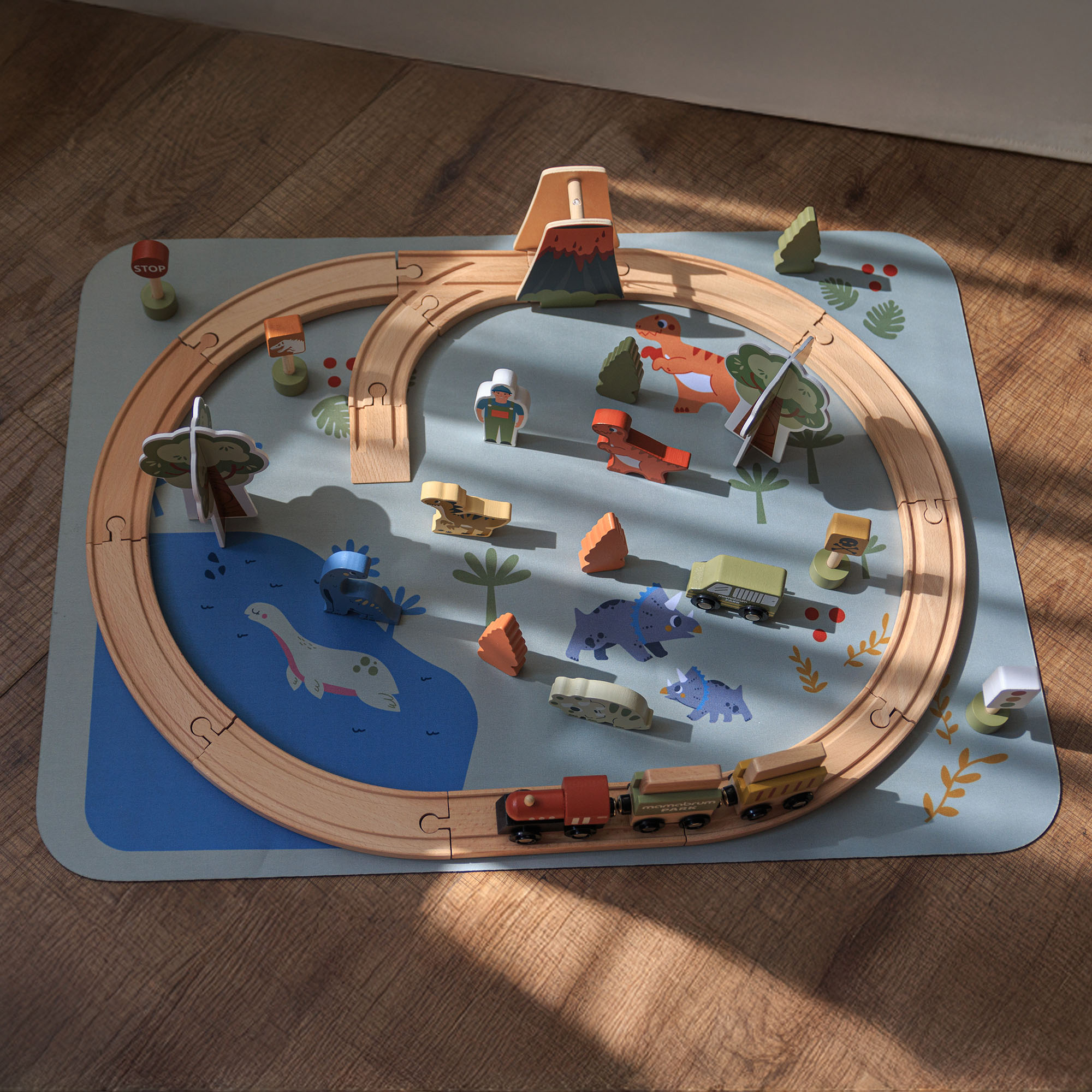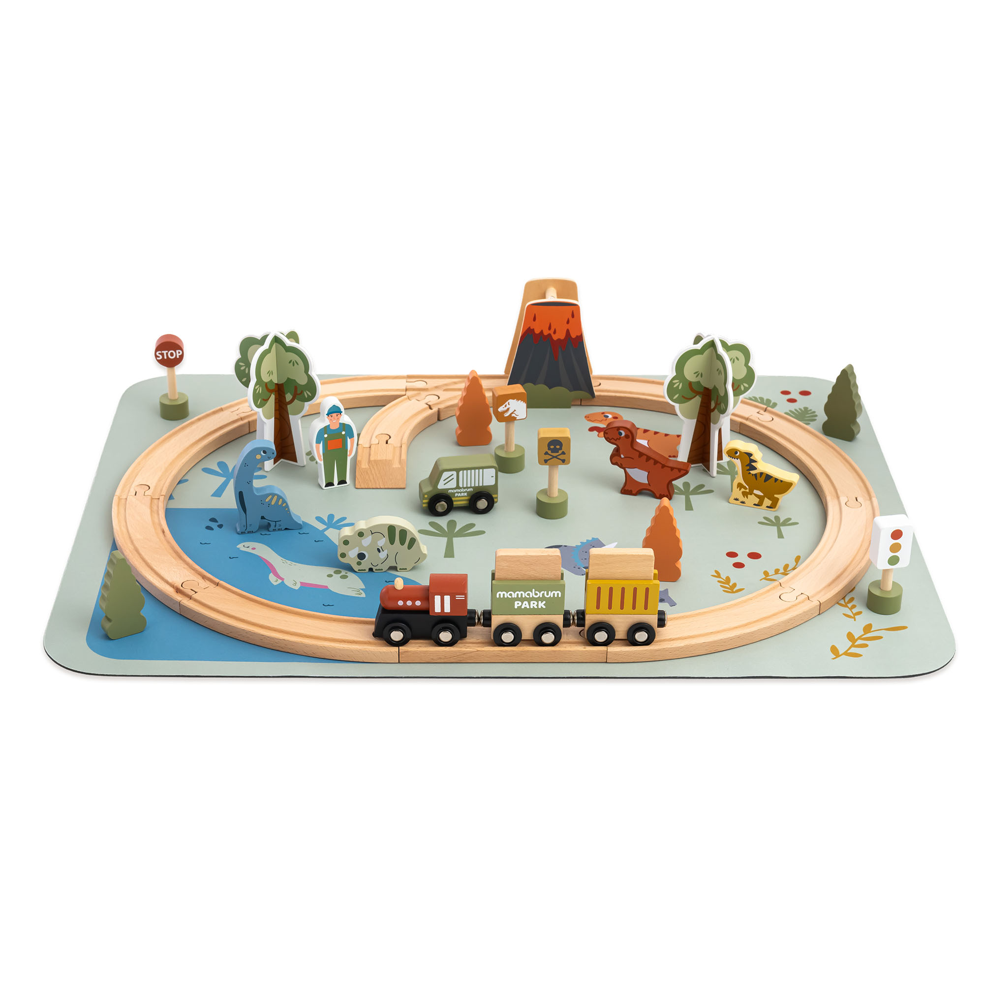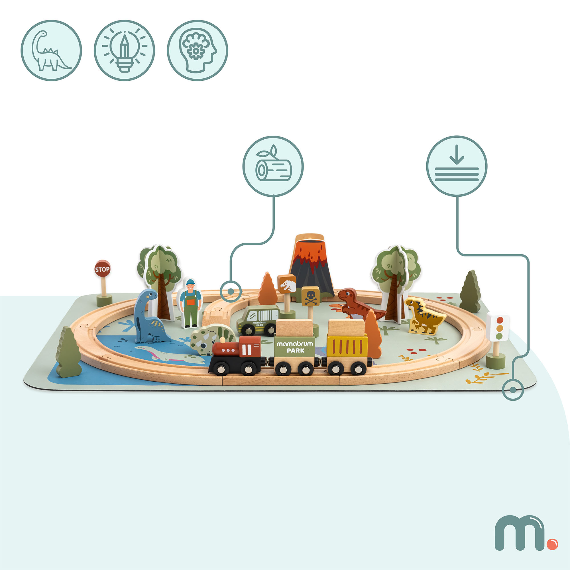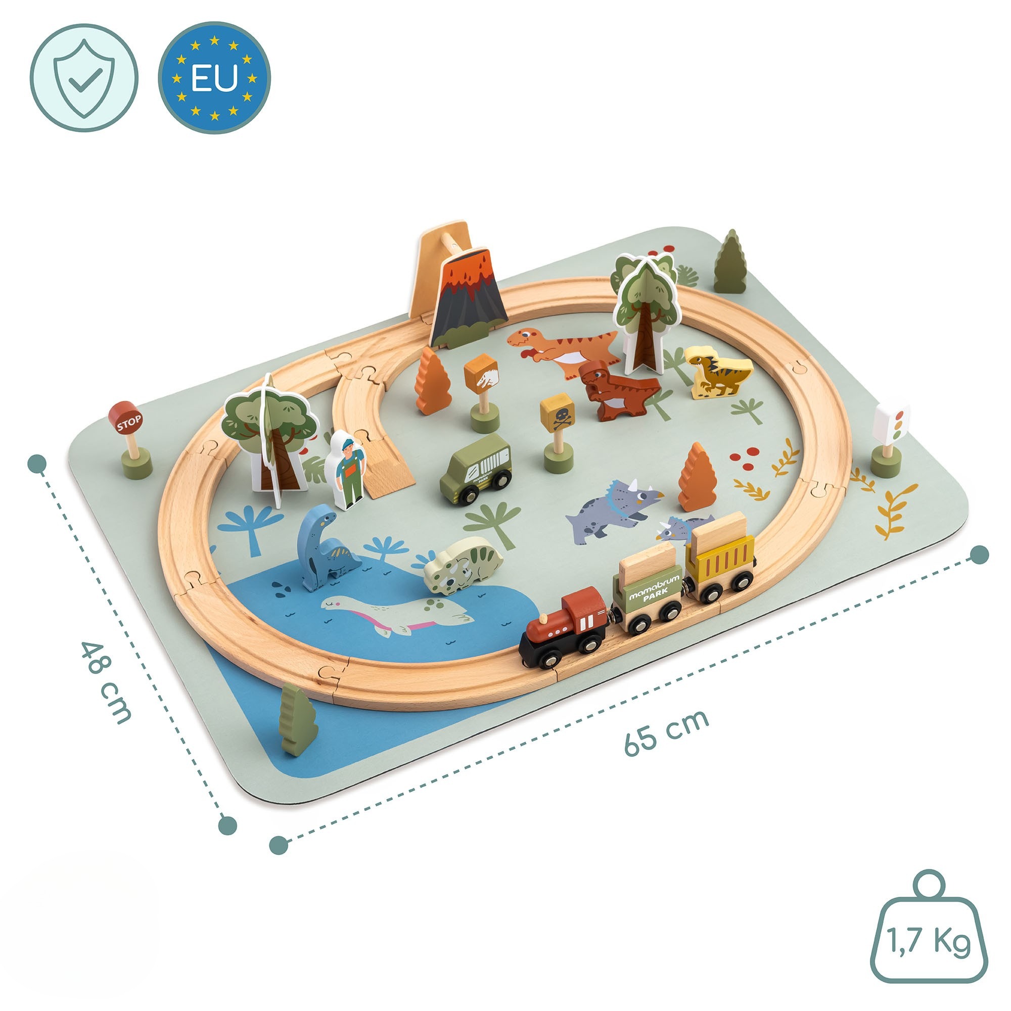 Vedur ja vagunid veavad kaupa läbi eelajaloolise maastiku ning kellukesekujulise vulkaanisõit lisab veelgi põnevust! Rong sõidab läbi dinosauruste maailma ja väikesed maadeavastajad täiendavad marsruuti liiklusmärkide ja puudega. See pole lihtsalt mänguasi – see on terve seiklusmaailm, mida teie laps saab iga päev taasluua.
