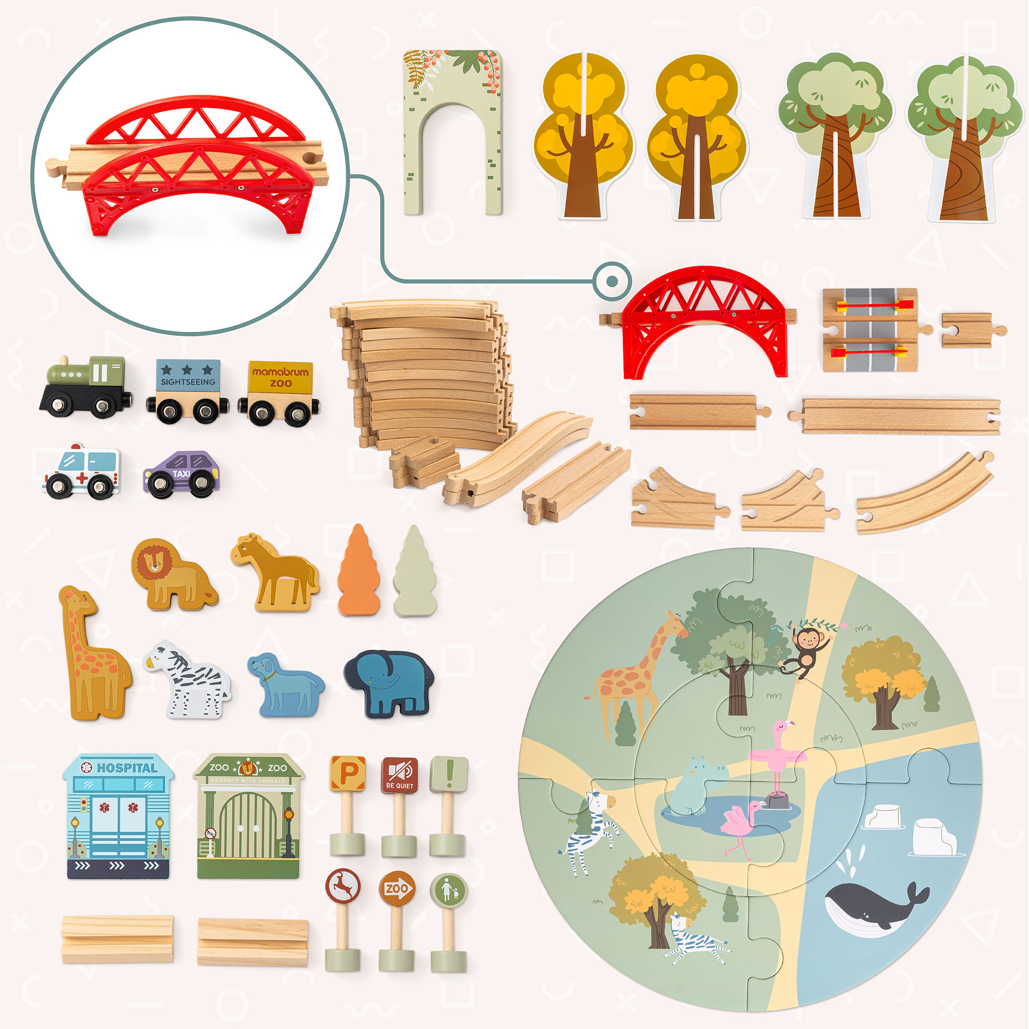 Komplekti keskpunktiks on pilkupüüdev punane sild ja puidust loomaaiavärav , mis köidavad laste tähelepanu ja loovad arvukalt mänguvõimalusi. Rong oma vagunitega sõidab üle silla ja jõuab loomaaiaväravani, kus ootab ees safari maagiline maailm . See on suurepärane võimalus õppida sotsiaalseid rolle ja arendada loovust – lapsed saavad välja mõelda lugusid loomaaia külastamisest või loomade eest hoolitsemisest.