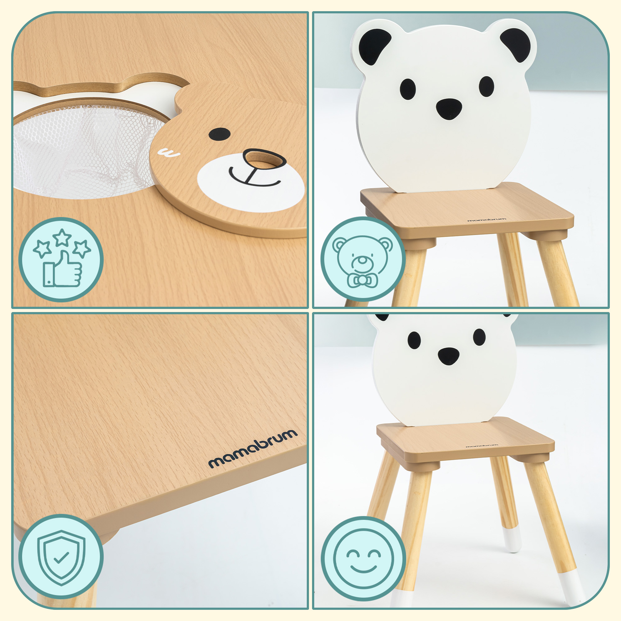 Komplekt pole mitte ainult visuaalselt meeldiv, vaid arendab ka laste iseseisvust. Panipaigaga laud aitab asju korras hoida , samas kui karukujuliste seljatugedega toolid soodustavad koos laua taga aja veetmist. Tänu sobivale istmekõrgusele (26,5 cm) on mööbel noortele kasutajatele mugav ja ohutu.
