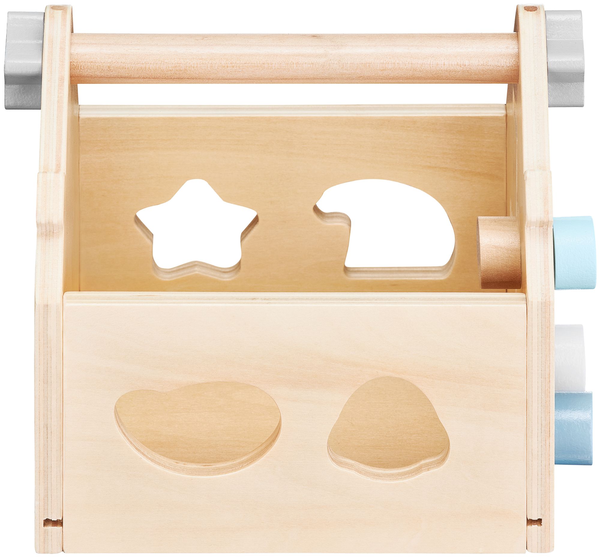 Komplekti kuuluvad kaheksa puuklotsimille laps peab majas olevatesse aukudesse sobitama. Külgseinal on ka väike sensoorne tahvelmillele laps saab harjutada oma silmade-käe koordinatsiooni.