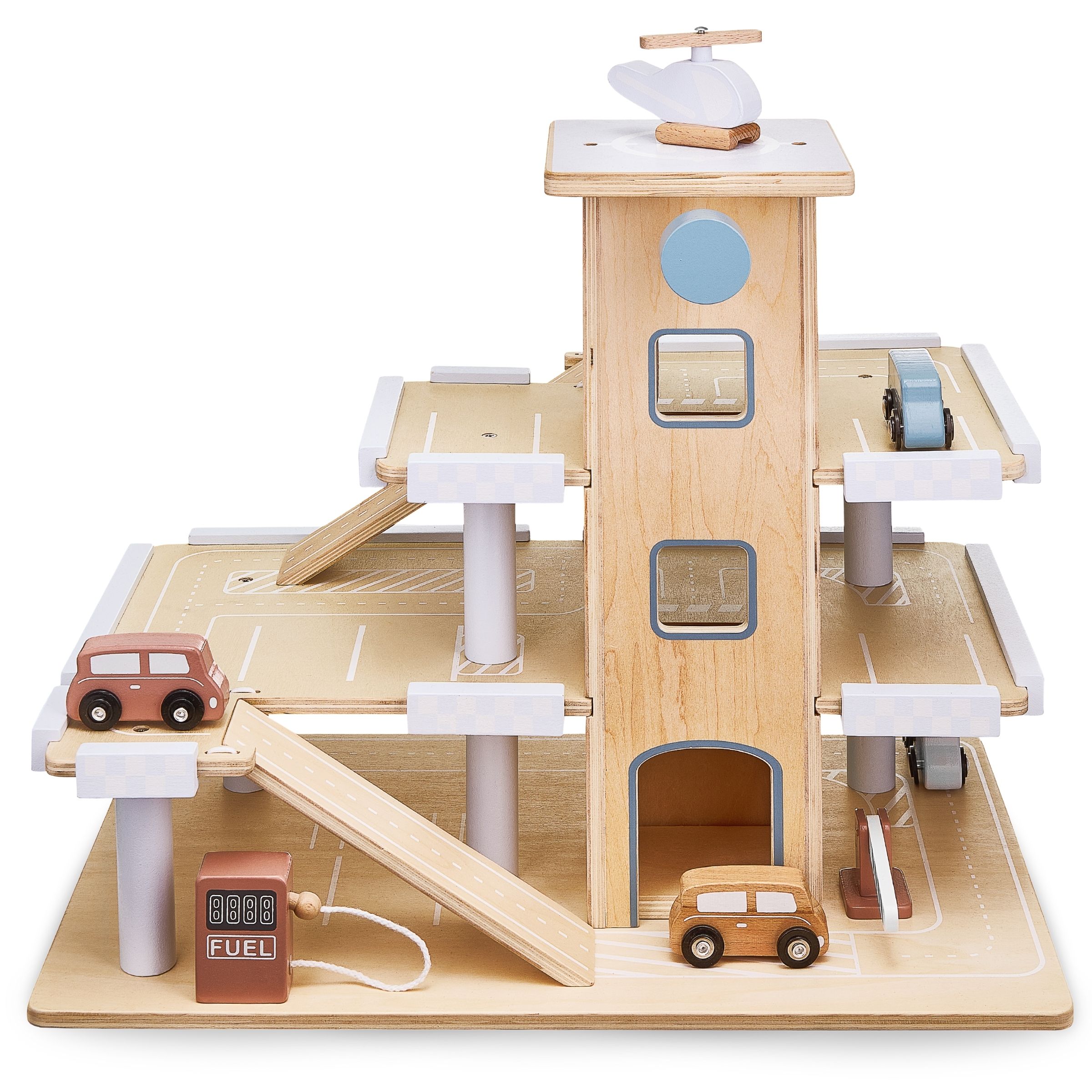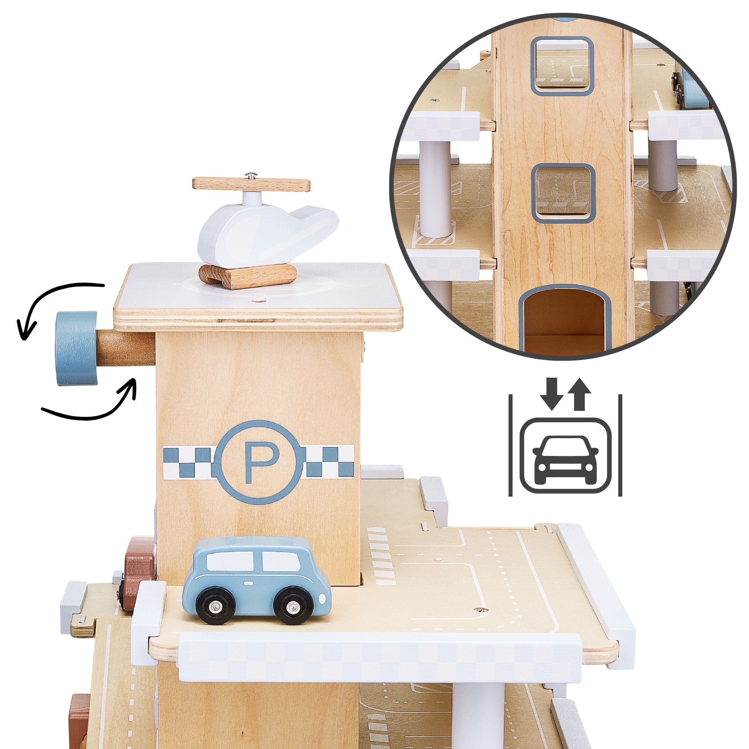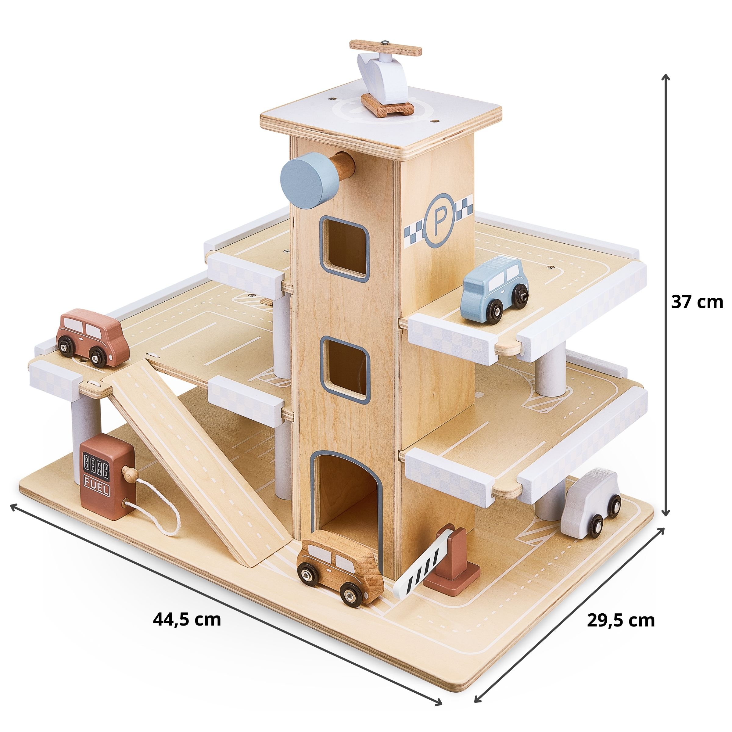 Kolmetasandiline puidust parkla koos lifti, autode ja helikopteriga