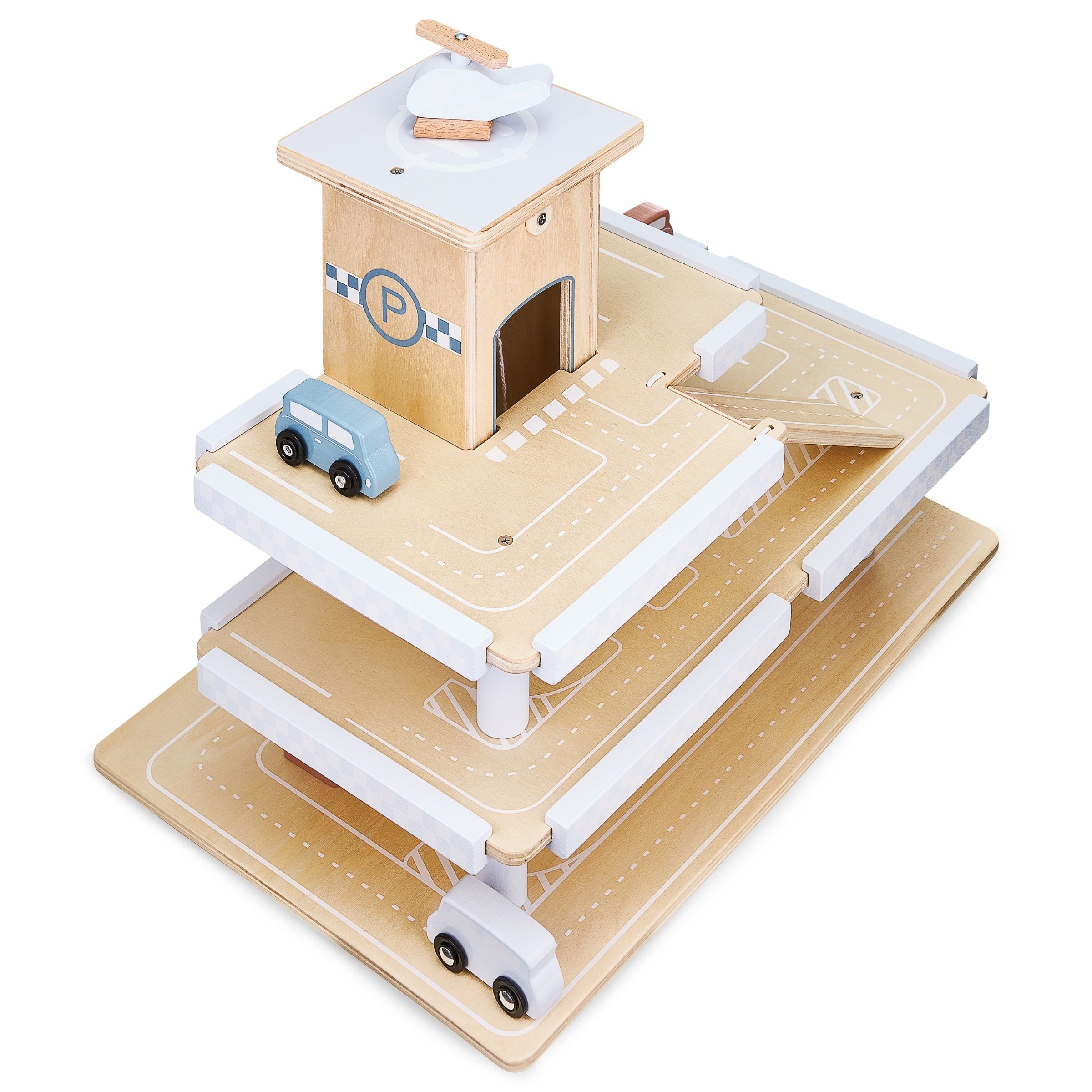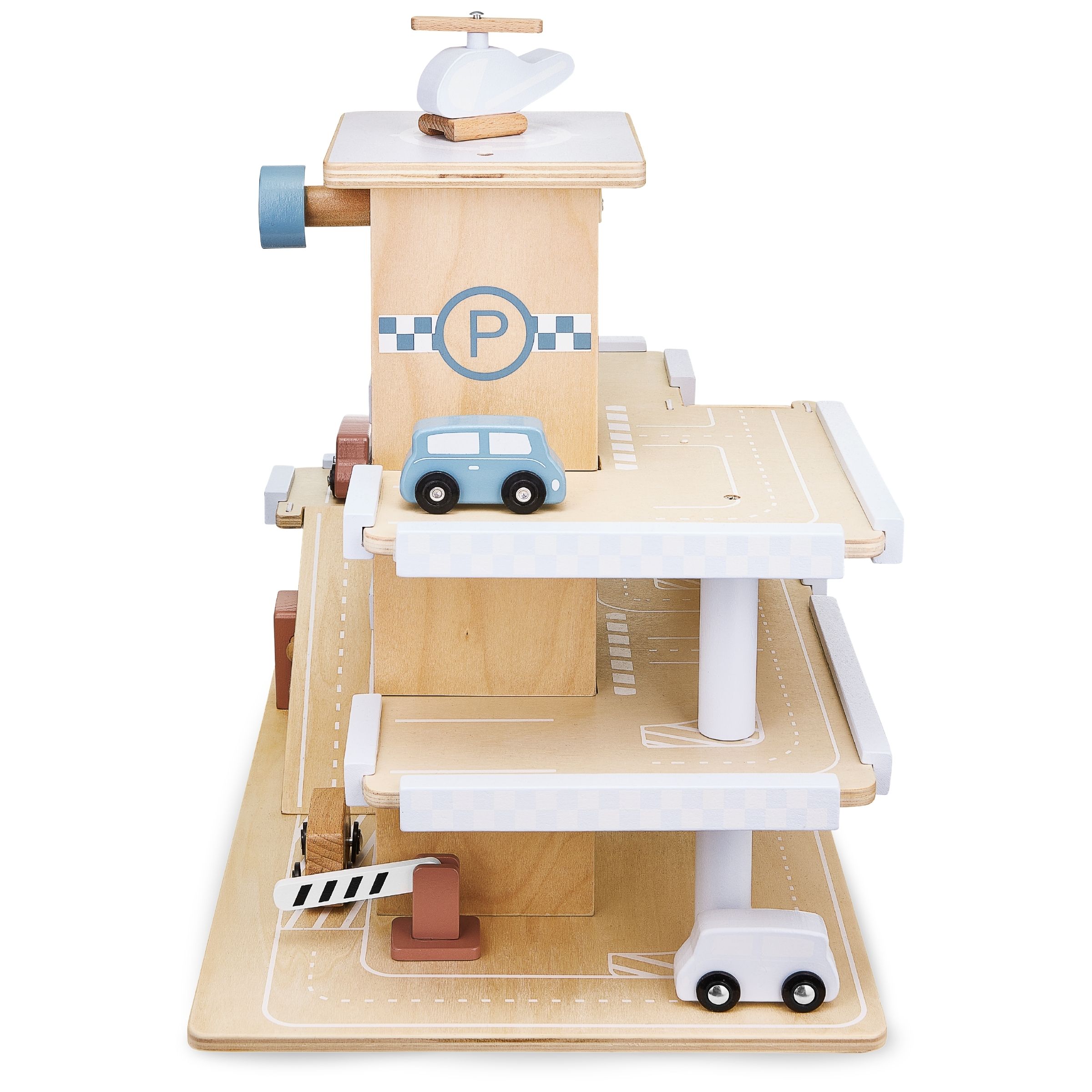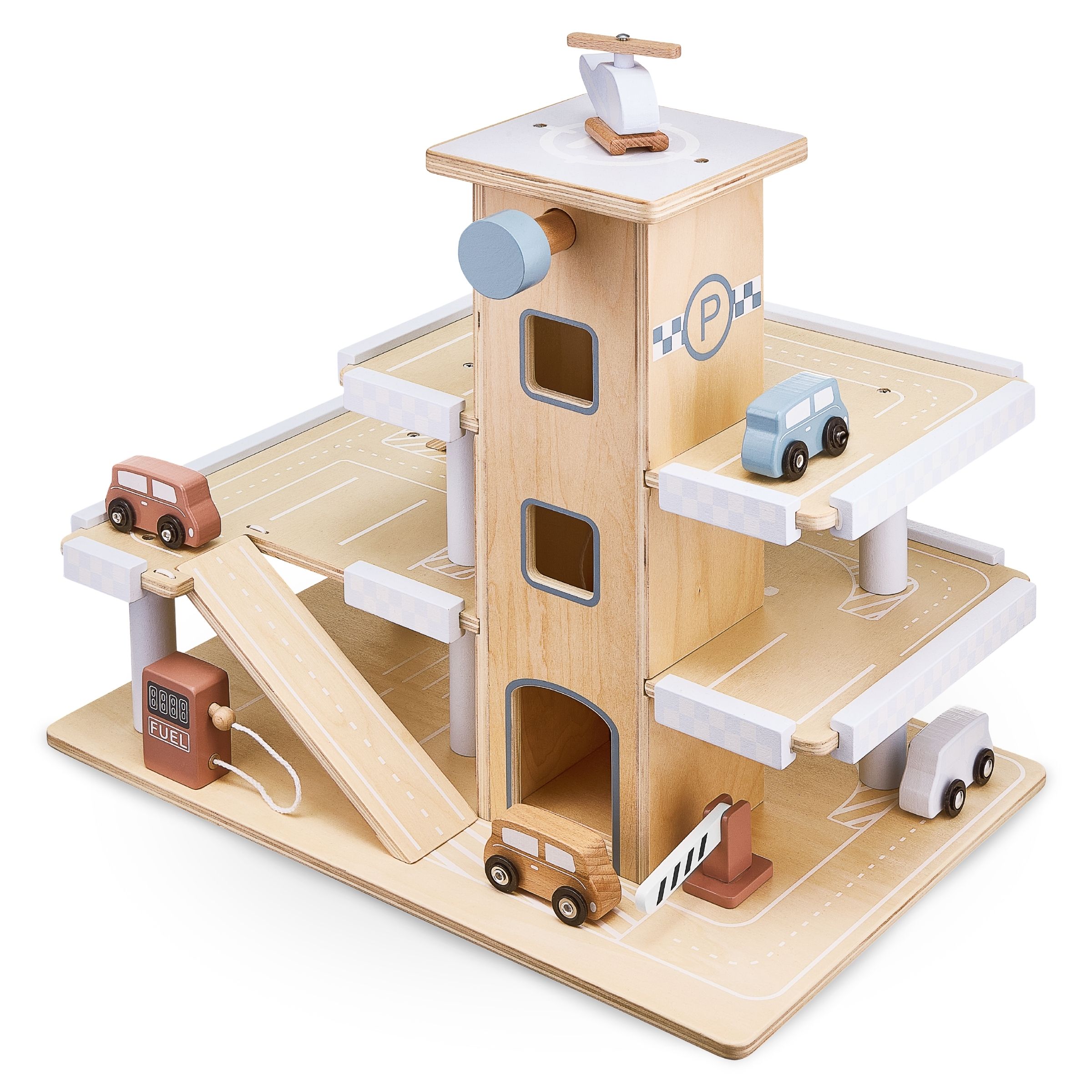 Kolmetasandiline puidust parkla koos lifti, autode ja helikopteriga