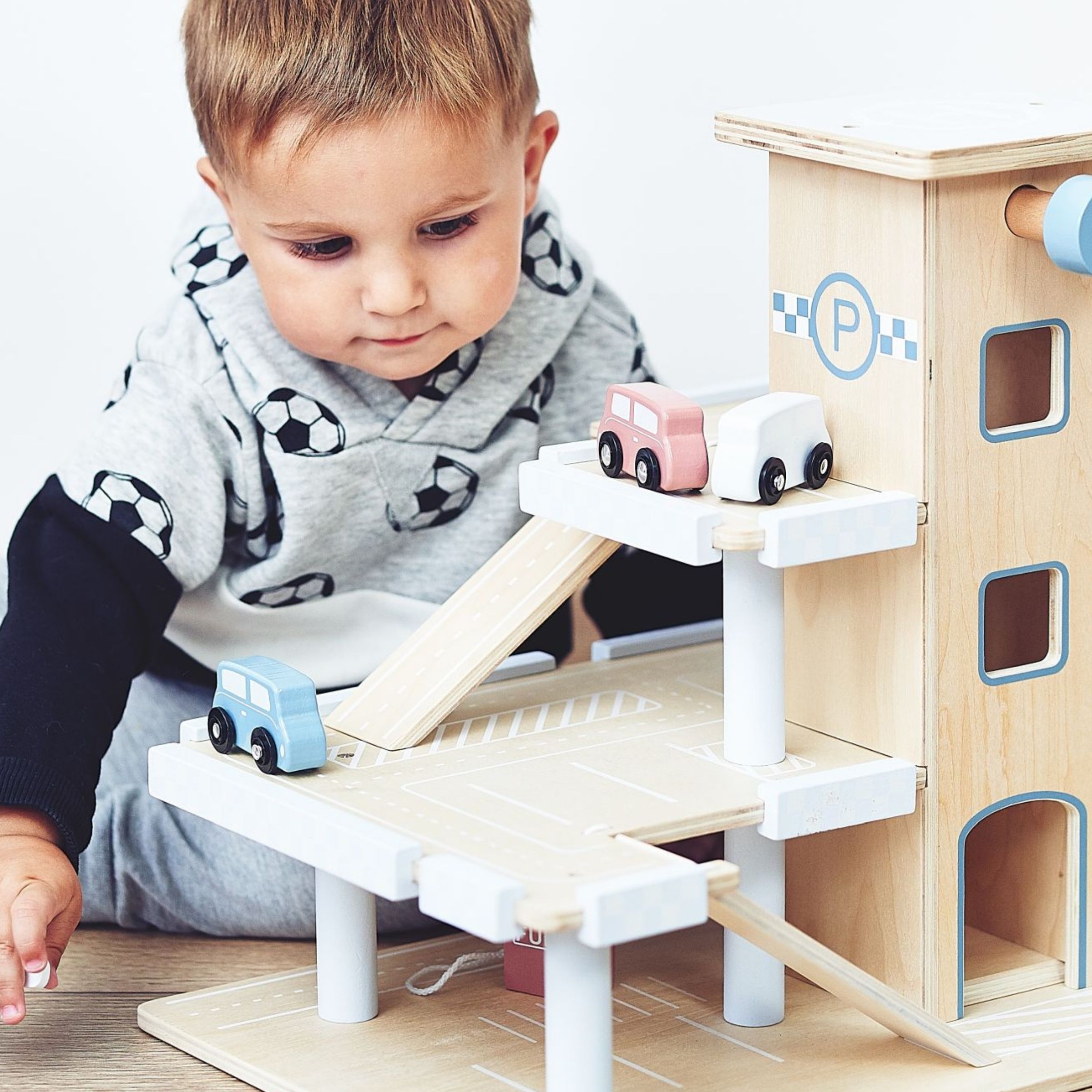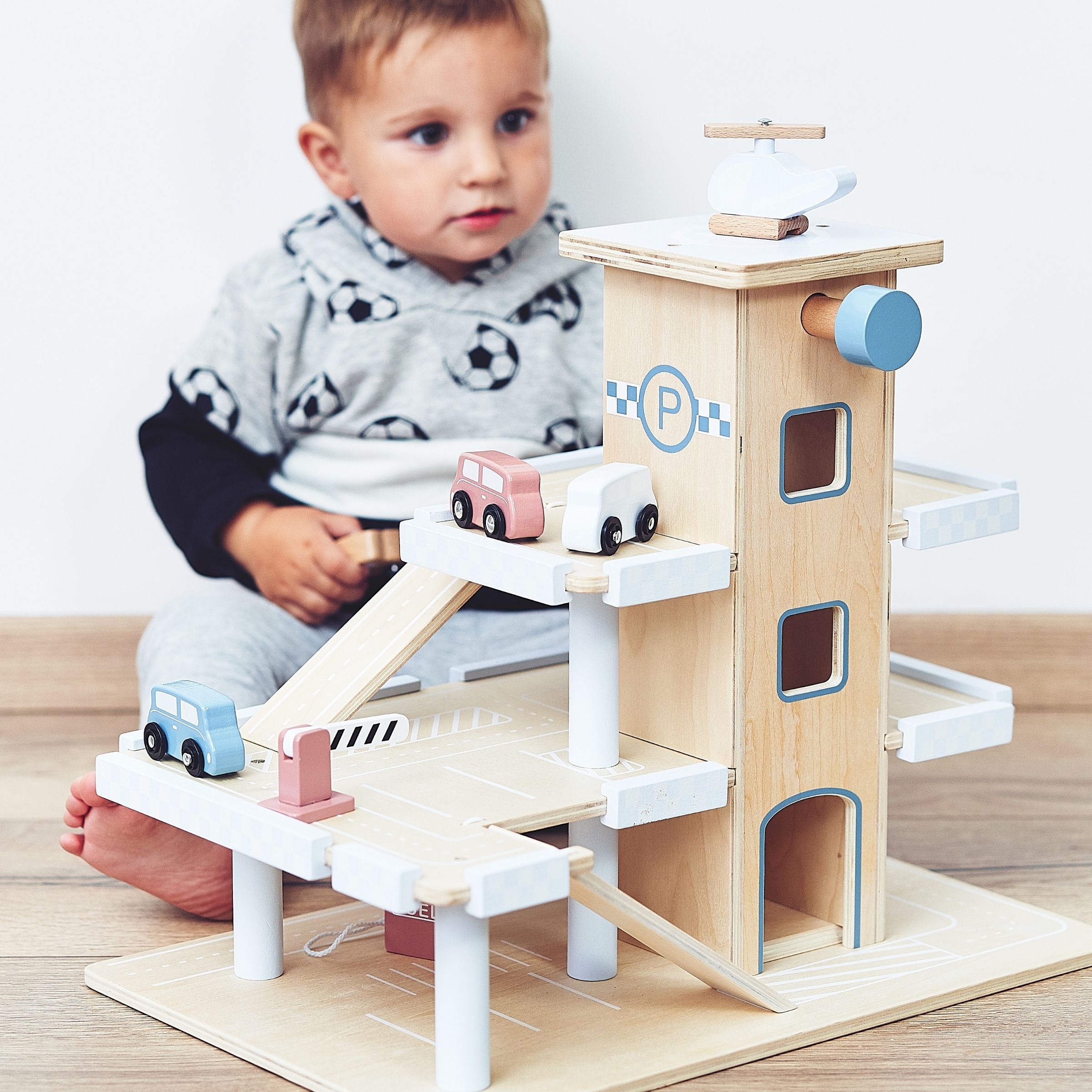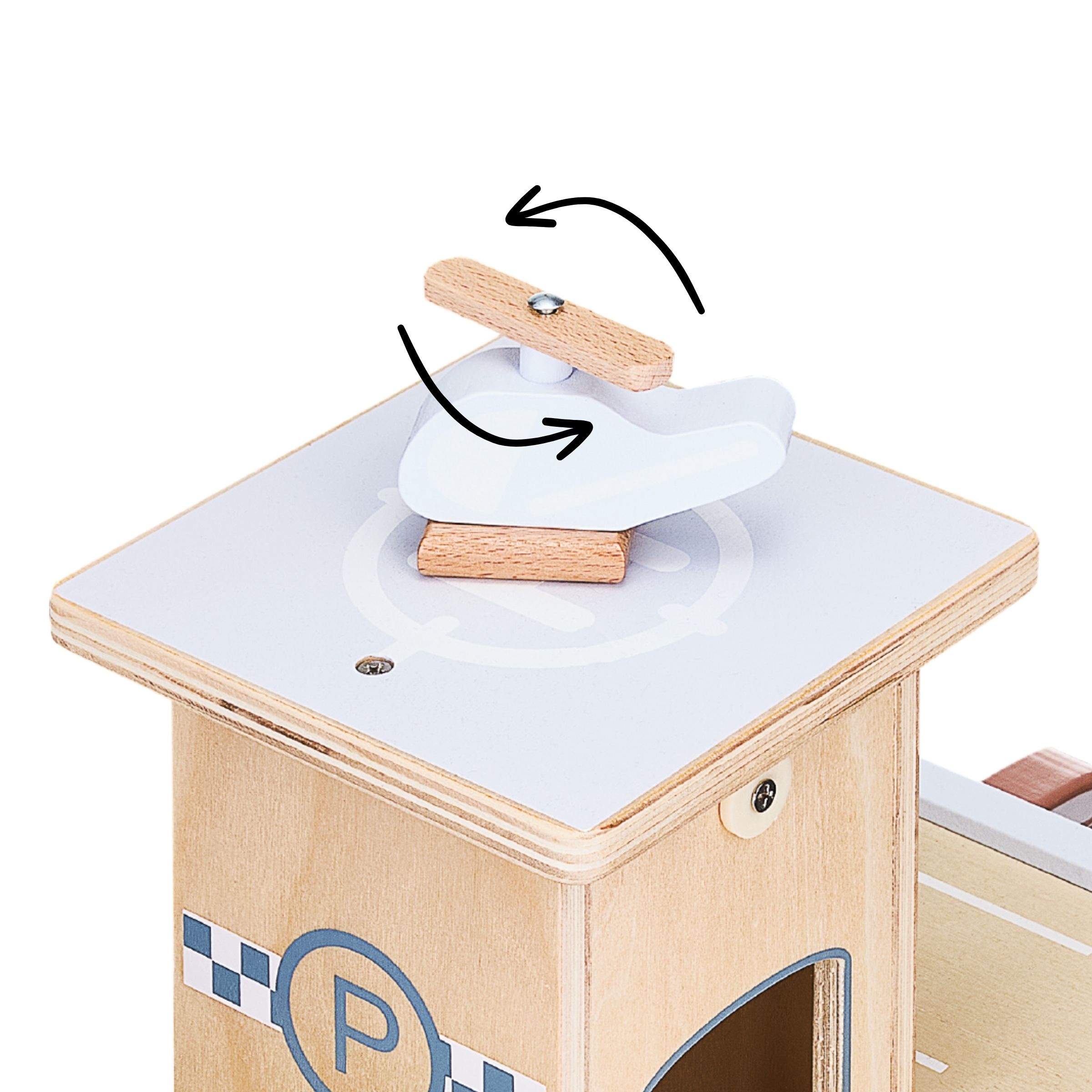 Garaažil on kolm tasandit ja liugur. Nii loominguline kui laps saab mängida puidust mänguasjaga. Mängimise ajal harjutab laps silma-käe koordinatsiooni. Mänguasi on valmistatud kvaliteetsest puidust vineerist, tarvikud on värvitud ökoloogiliste värvidega.