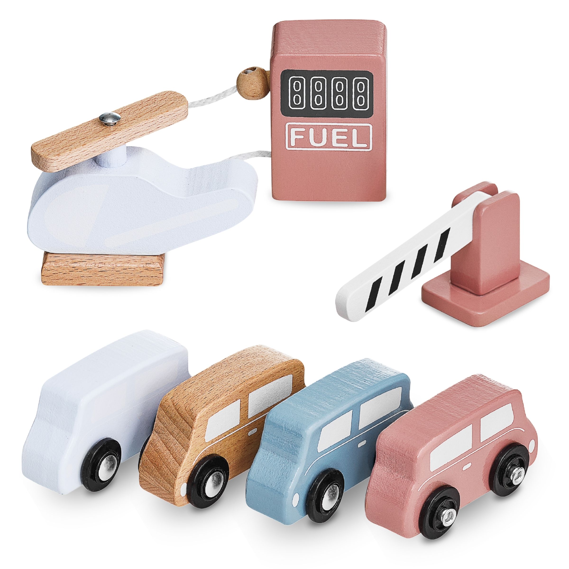 Sellel on 4 autot, 1 helikopter, platvorm, tõkkepuu ja bensiinijaam ning autode tõstuk.