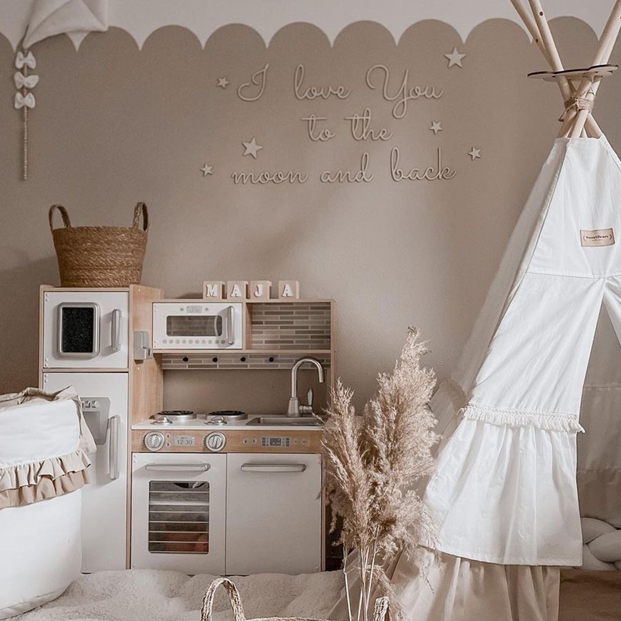 Selle summutatud värvid sobivad igasse lastetuppa. Köögi disain on disainerlik ja ainulaadne. Puidust töötasapind imiteerib terrazzot. Liikuvad osad on hoolikalt valmistatud.