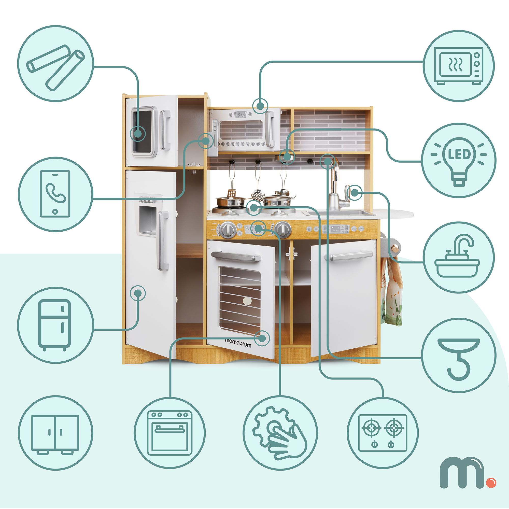 Tarvikud, nagu lusikas, kühvel ja spaatel, on tõetruult jäljendatud täiskasvanute versioonist. Köök on valmistatud puidust.