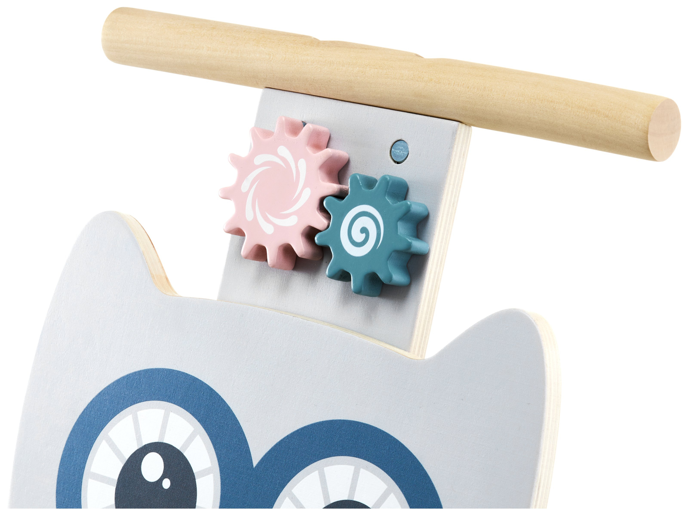Öökullil on puidust käepide, mis on kindlalt kinnitatud konstruktsiooni külge. Tänu sellele saab väikelaps turvaliselt liikuda. Käepideme all on veel üks üllatus - kaks värvilist hammasratta kujuga nuppu, mis töötavad täpselt nagu päriselt - üks ajab teist. Veel üks mõistatus väikesele uurijale!