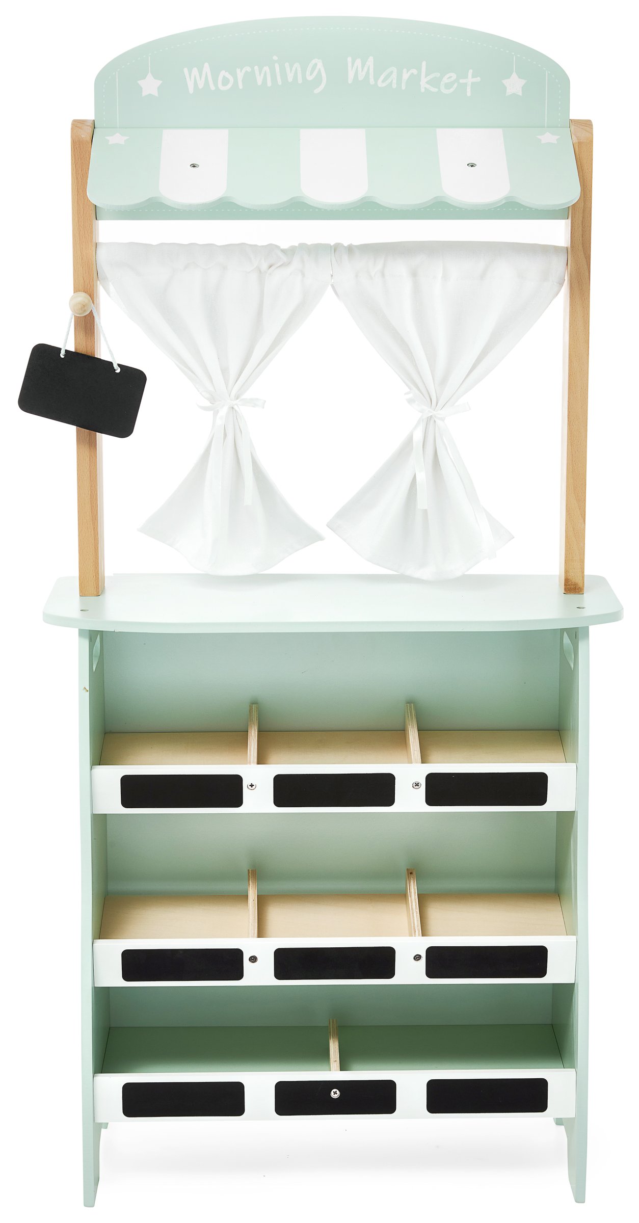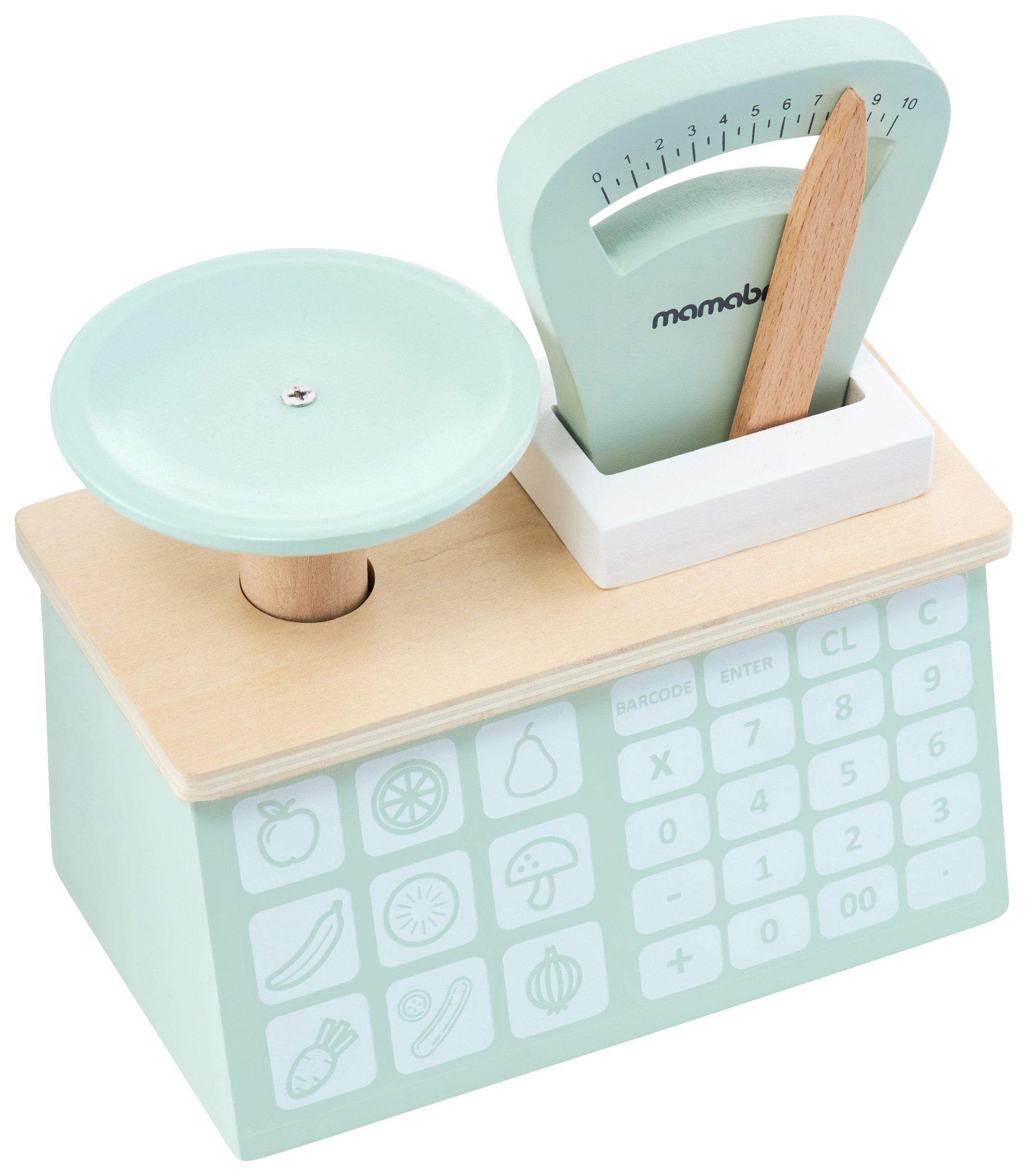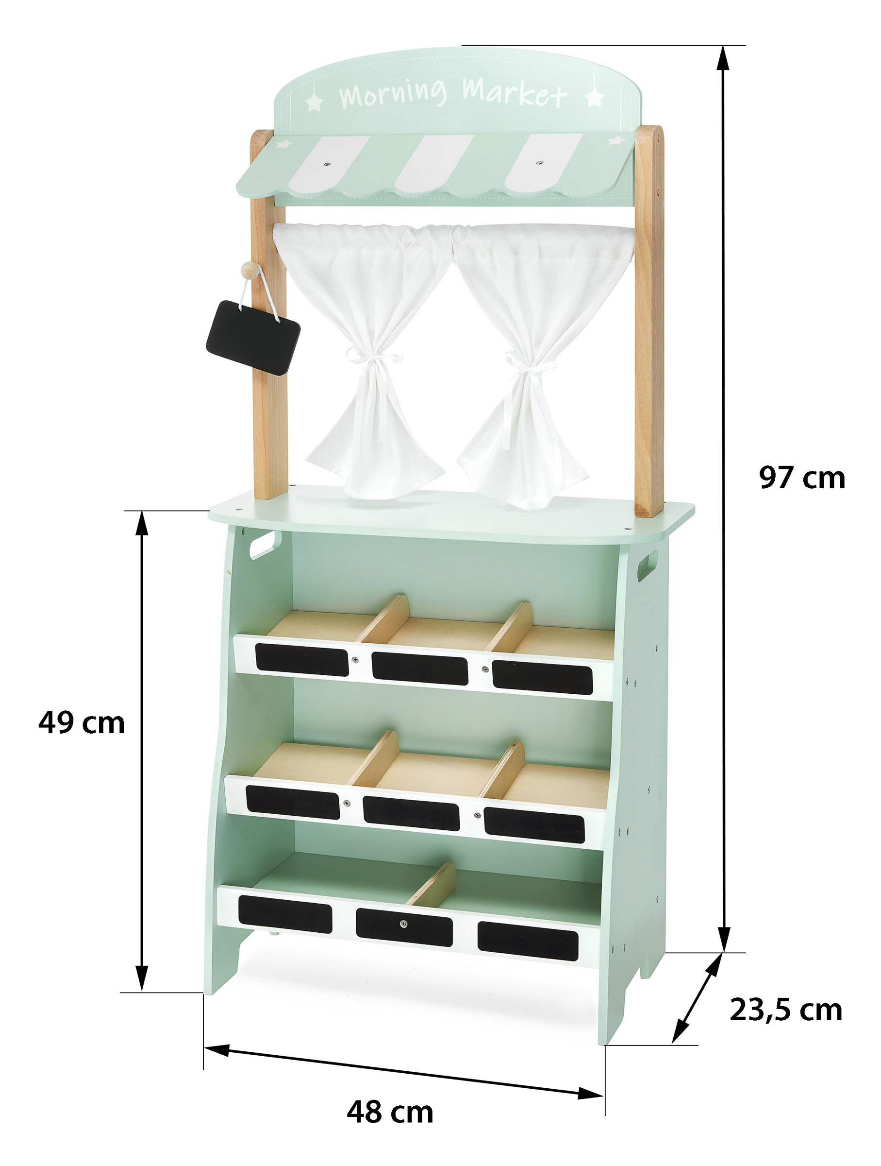 Mänguasjal on kujutatud ühel küljel köögiviljapood, mis on kaunistatud võluva markiisi ja õrnade kardinatega. Väikesel müüjal on mobiilne kaal, maksekaardiga terminal ja 16 tükki puu- ja köögivilju, nagu porgandid, banaanid, tomatid, seened, pirnid, sidrunid küüslauk või mahlakad õunad. Iga köögi- või puuviljaosa koosneb kahest poolitusest, mis on ühendatud Velcro-kinnitusega, nii et neid saab lõigata ja seejärel uuesti kokku panna. Leti all on 8 lahtrit, kuhu saab sildistada jooksvad hinnad. Ära unusta kirjutada tänaseid sooduspakkumisi spetsiaalsele tahvlile!