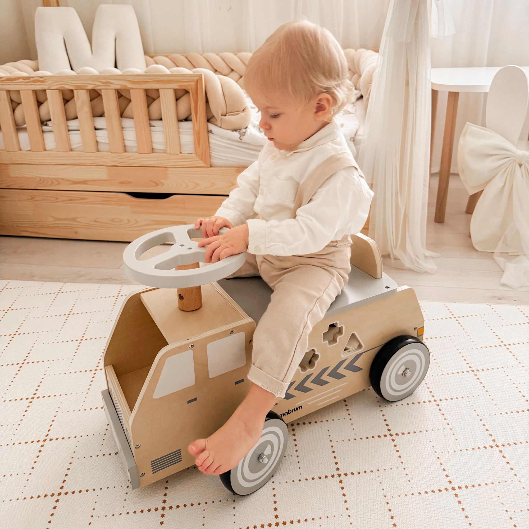 Autole on iseloomulikud järgmised omadused ilus skandinaavia disain. See on värvitud tagasihoidlikes värvides, mis rõhutavad materjalide loomulikku värvi. Mänguasja rattad on kinnitatud spetsiaalse kummi abil, mis on libisemisvastane ja takistab pindade kriimustamist.