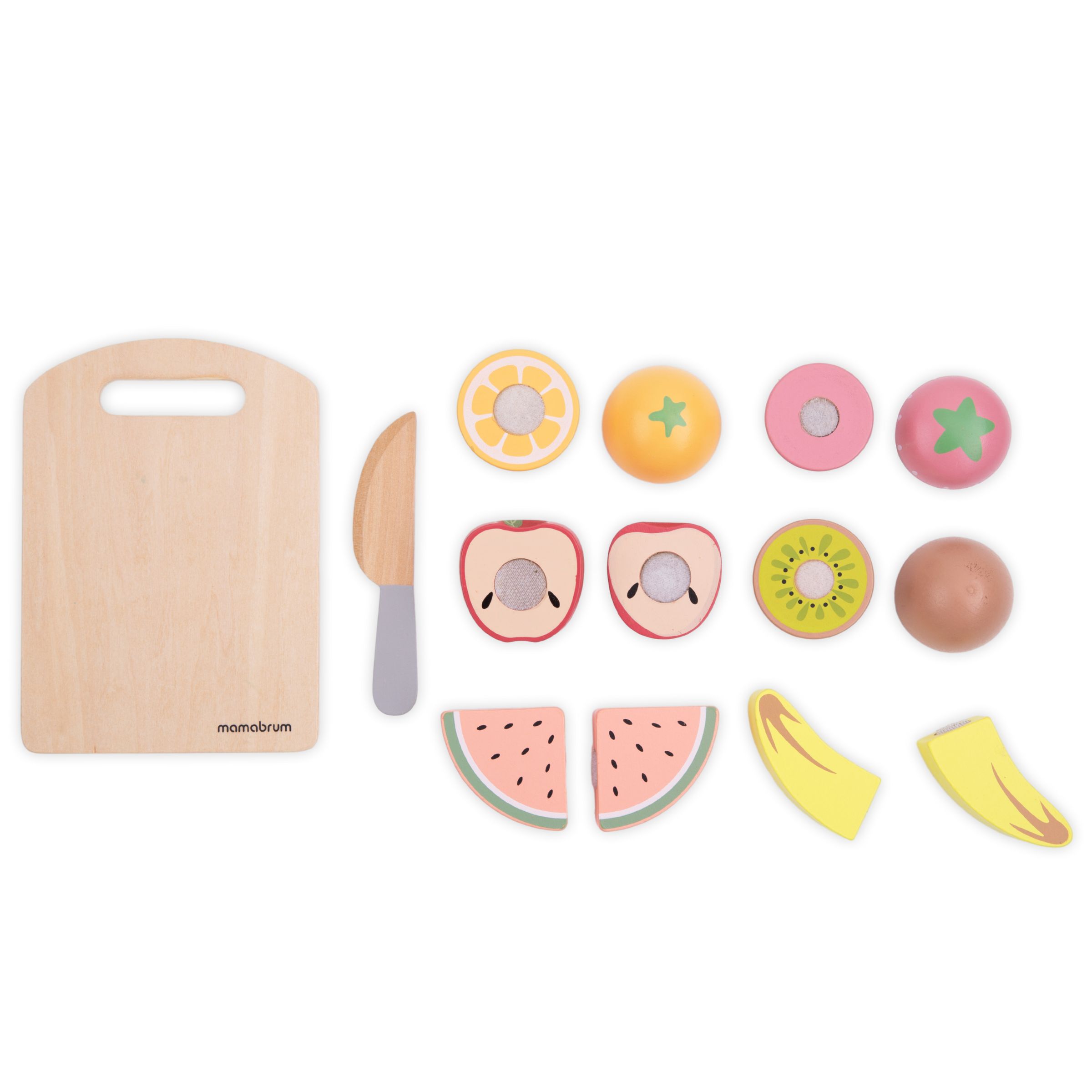 Iga puuvilja saab hõlpsasti "lõigata" pooleks, kasutades selleks puust nuga. Tänu tugevatele Velcro-kinnitustele saab väikelaps need hõlpsasti uuesti kokku panna. See mänguasi võimaldab lapsel võtta väikese koka rolli ja aidata oma vanematel söögi valmistamisel. Puulauale puuviljade viilutamine aitab parandada ka lapse käelisi oskusi.